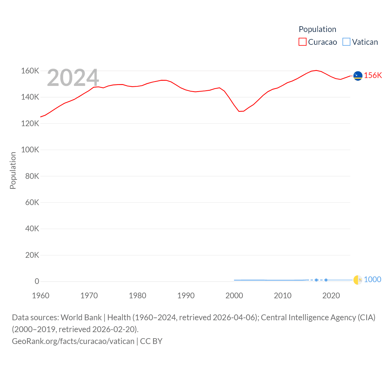 Curacao has a population of 156K (ranked 179/197), compared with 1K in The Vatican (ranked 197/197). Curacao's land area is 171.4 sq mi versus 0.17 sq mi for The Vatican (ranked 182nd vs. 197th).