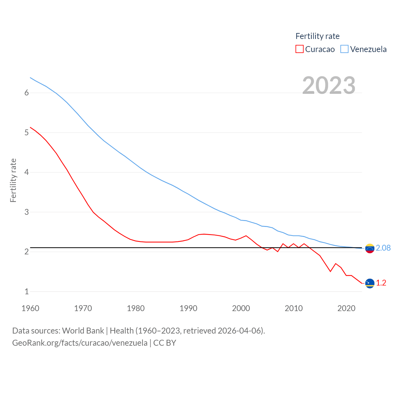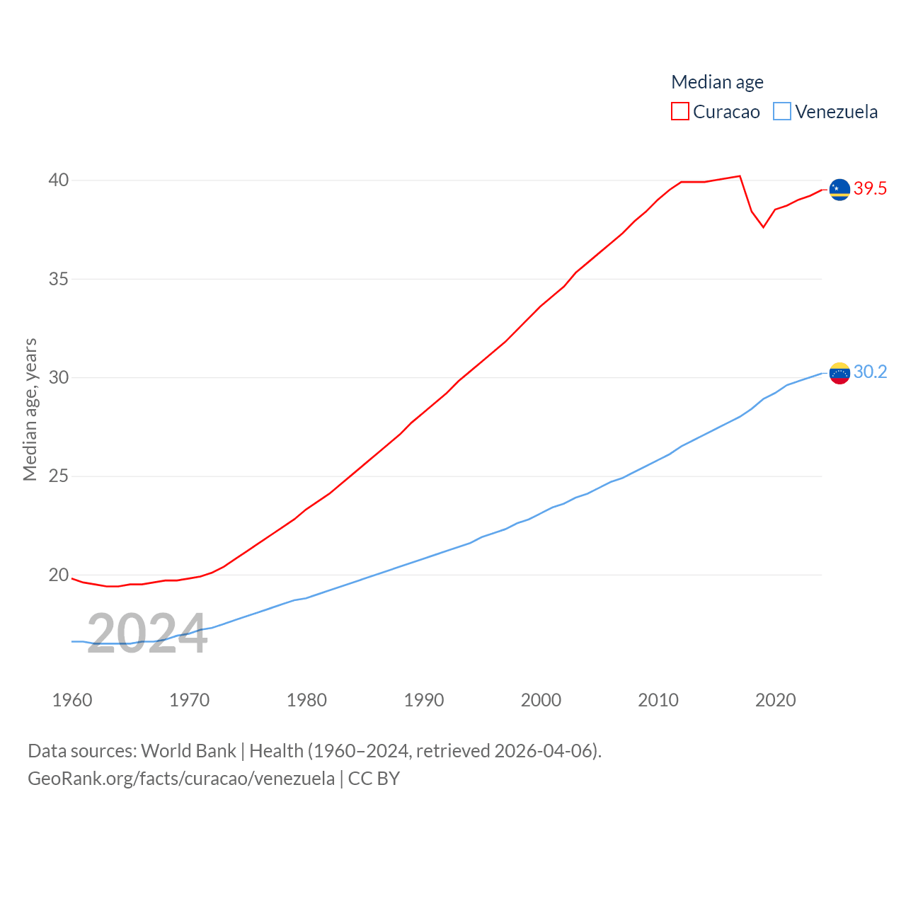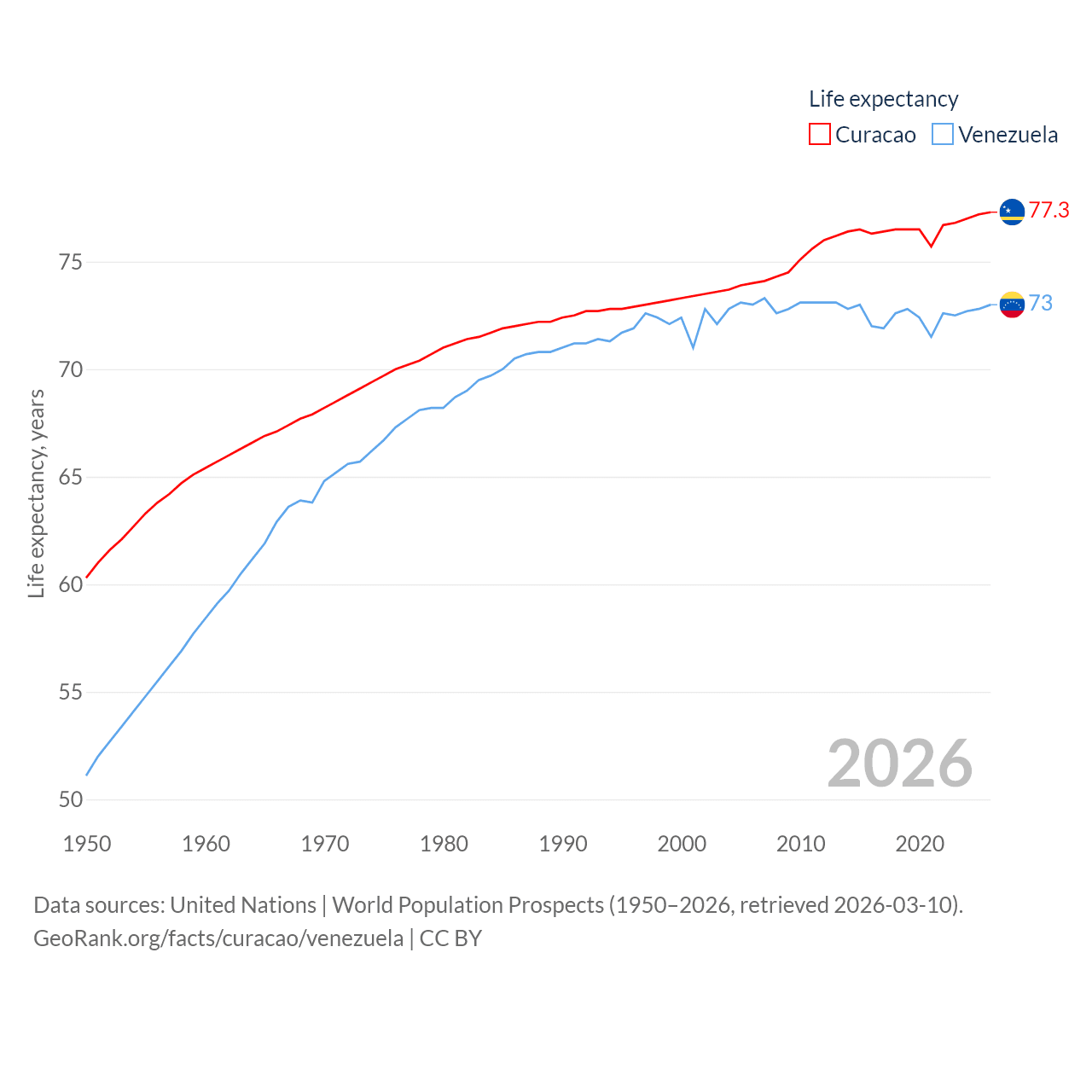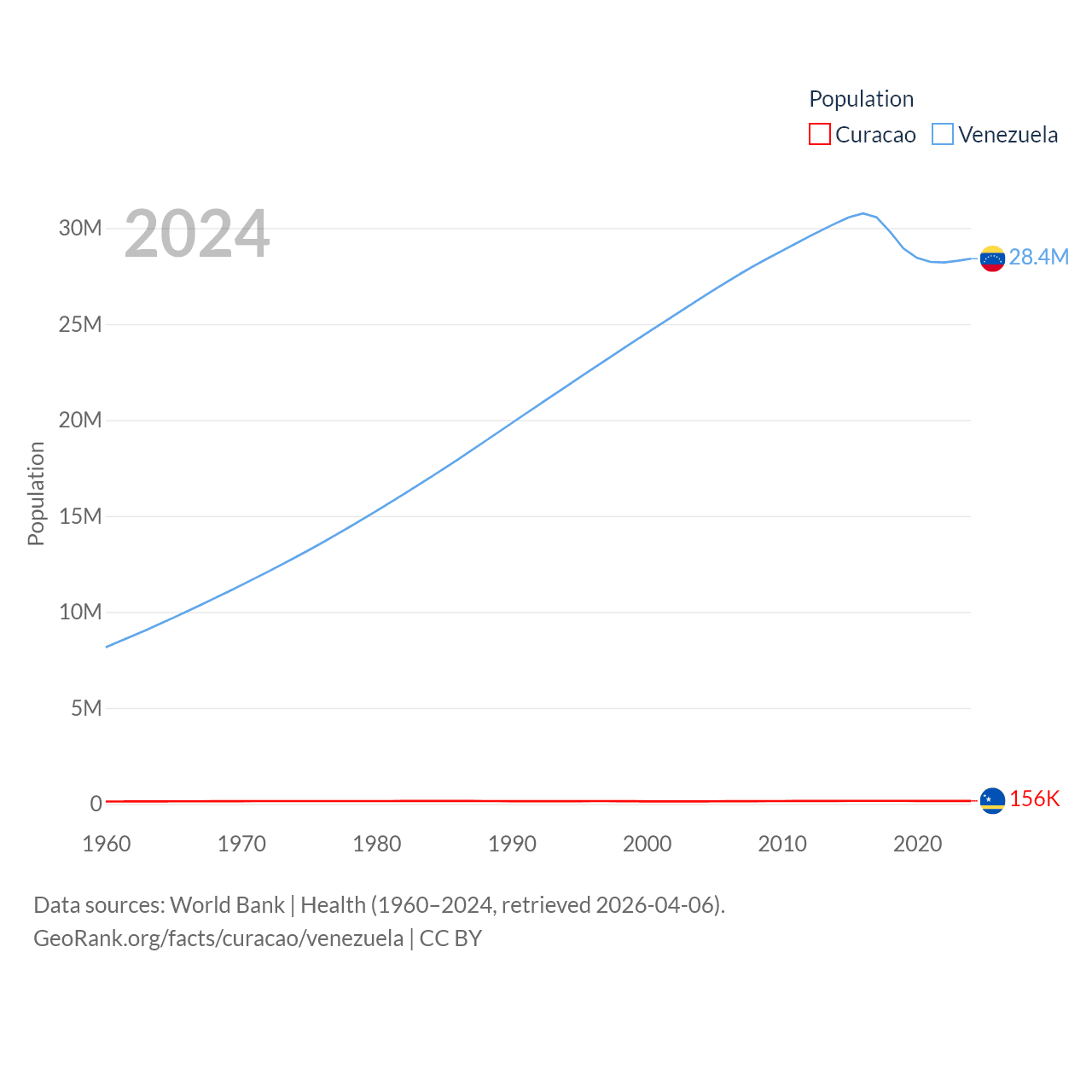 Curacao has a population of 156K (ranked 179/197), compared with 28.4M in Venezuela (ranked 53/197). Curacao's land area is 171.4 sq mi versus 340,561 sq mi for Venezuela (ranked 182nd vs. 32nd).