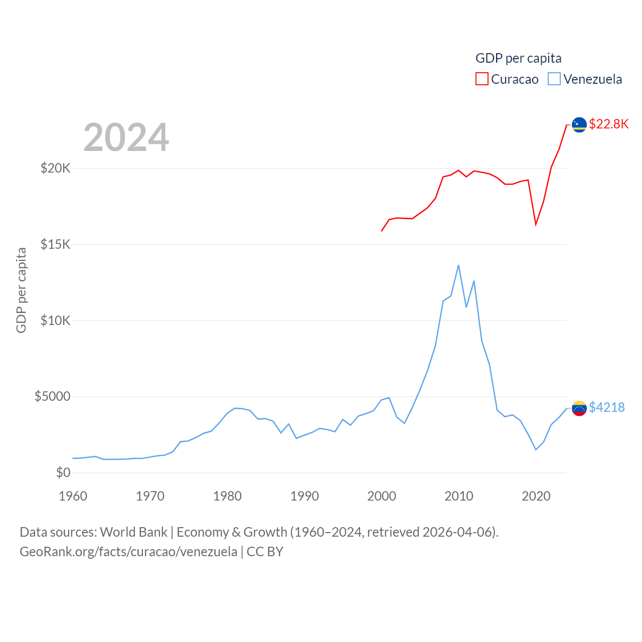 By GDP, Curacao ranks 167/197 ($3.56B) and Venezuela ranks 65/197 ($120B). By GDP per capita, Curacao ranks 56/197 ($22,833), while Venezuela ranks 128/197 ($4,218).
