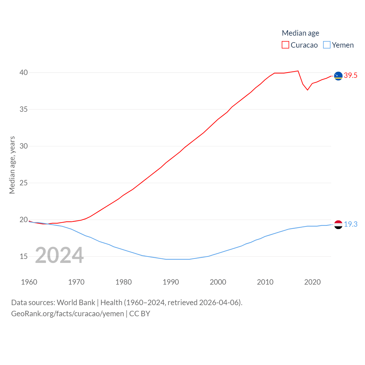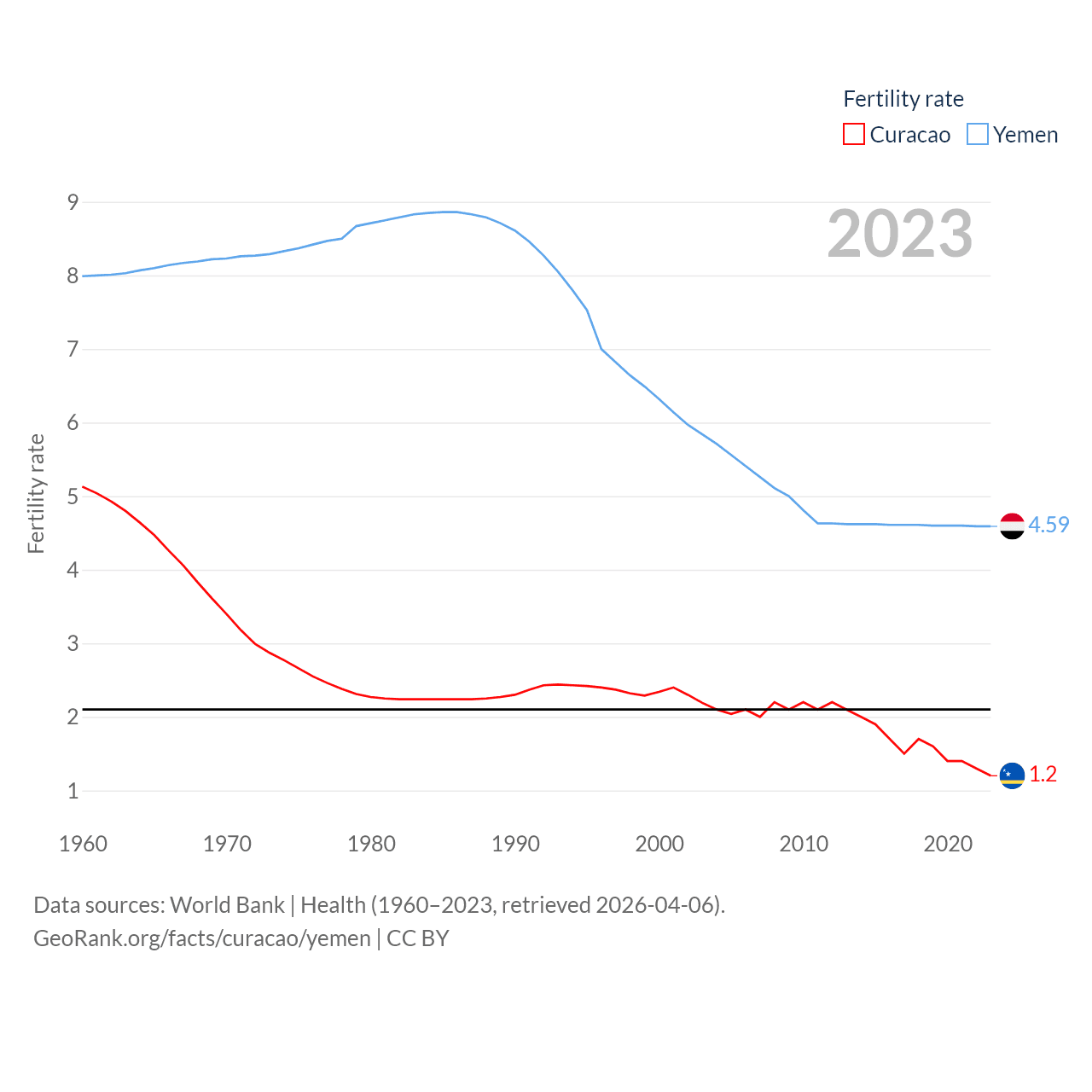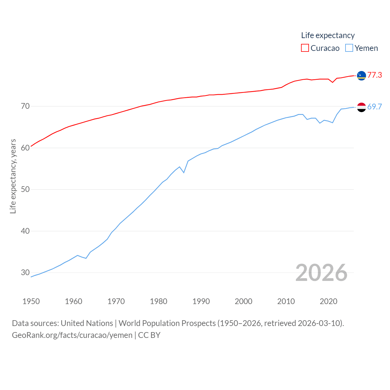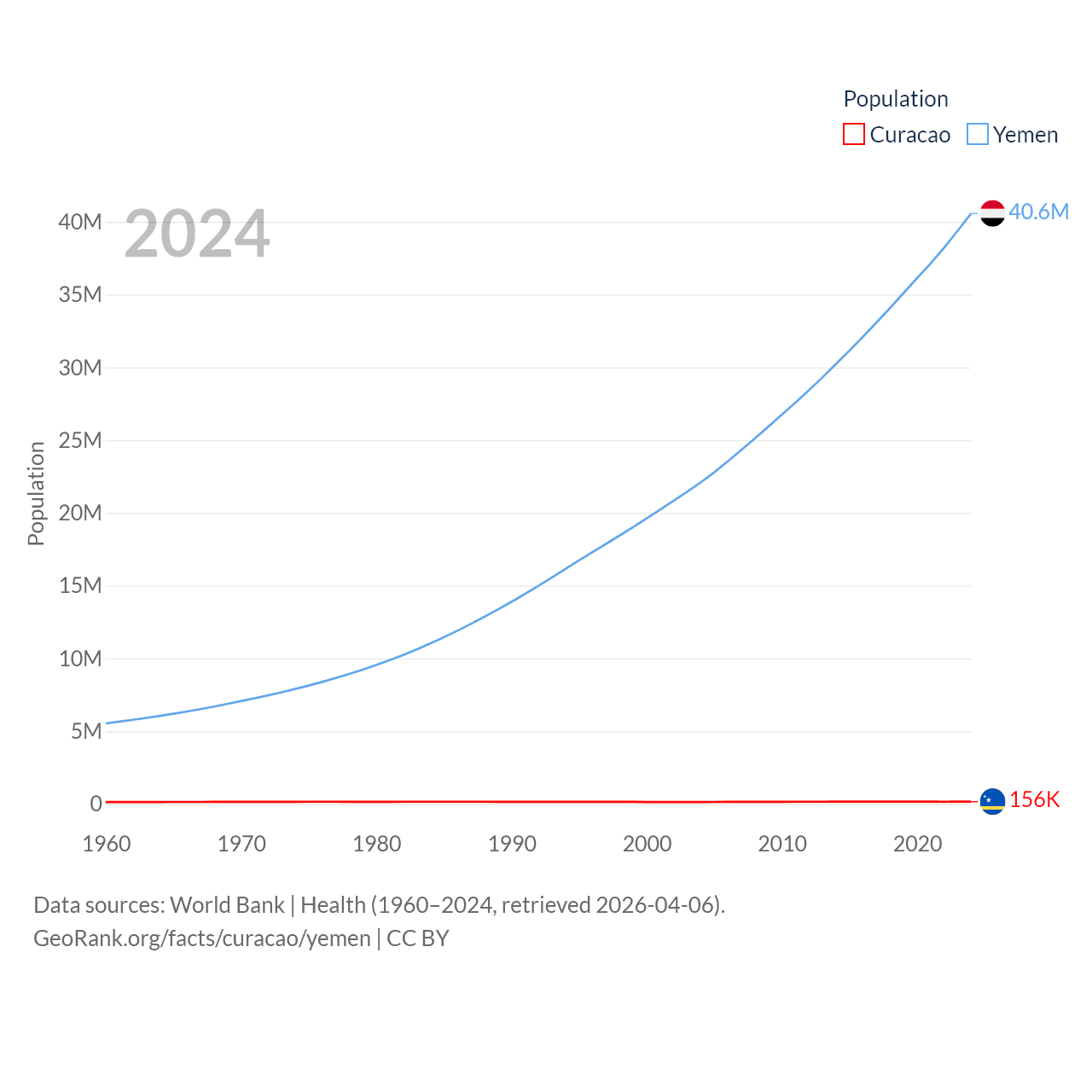Curacao has a population of 156K (ranked 179/197), compared with 40.6M in Yemen (ranked 38/197). Curacao's land area is 171.4 sq mi versus 203,850 sq mi for Yemen (ranked 182nd vs. 49th).