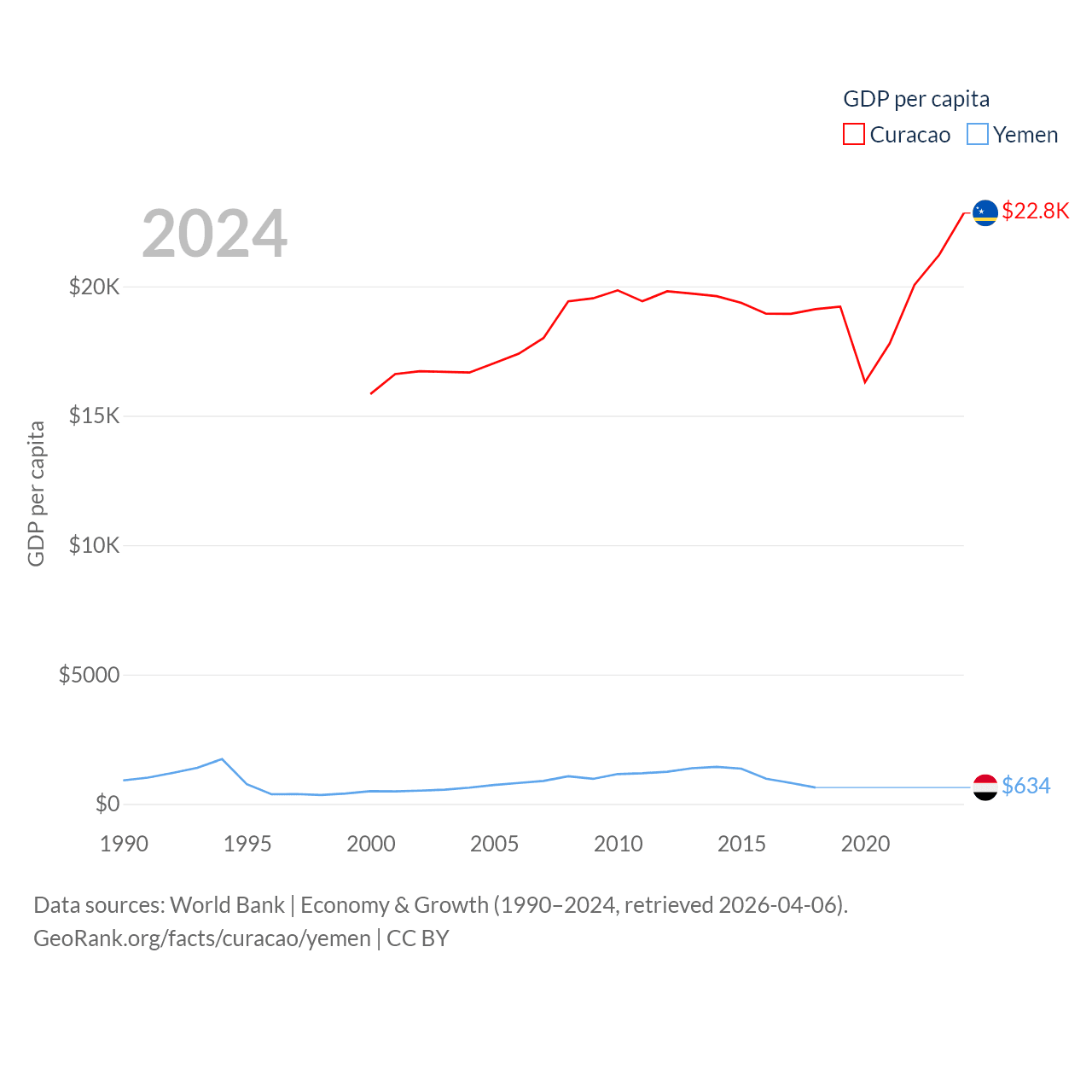 By GDP, Curacao ranks 167/197 ($3.56B) and Yemen ranks 125/197 ($21.6B). By GDP per capita, Curacao ranks 56/197 ($22,833), while Yemen ranks 191/197 ($634).