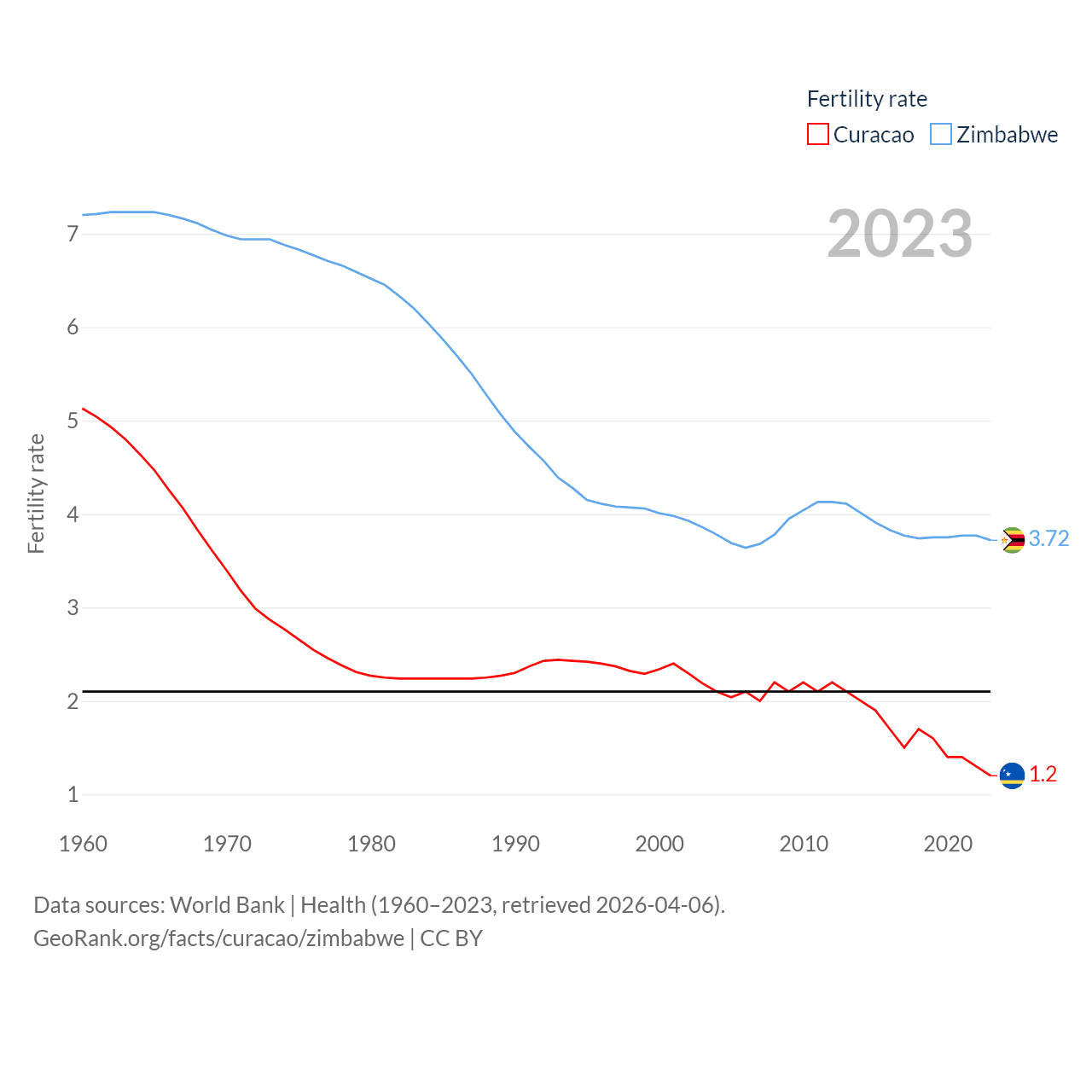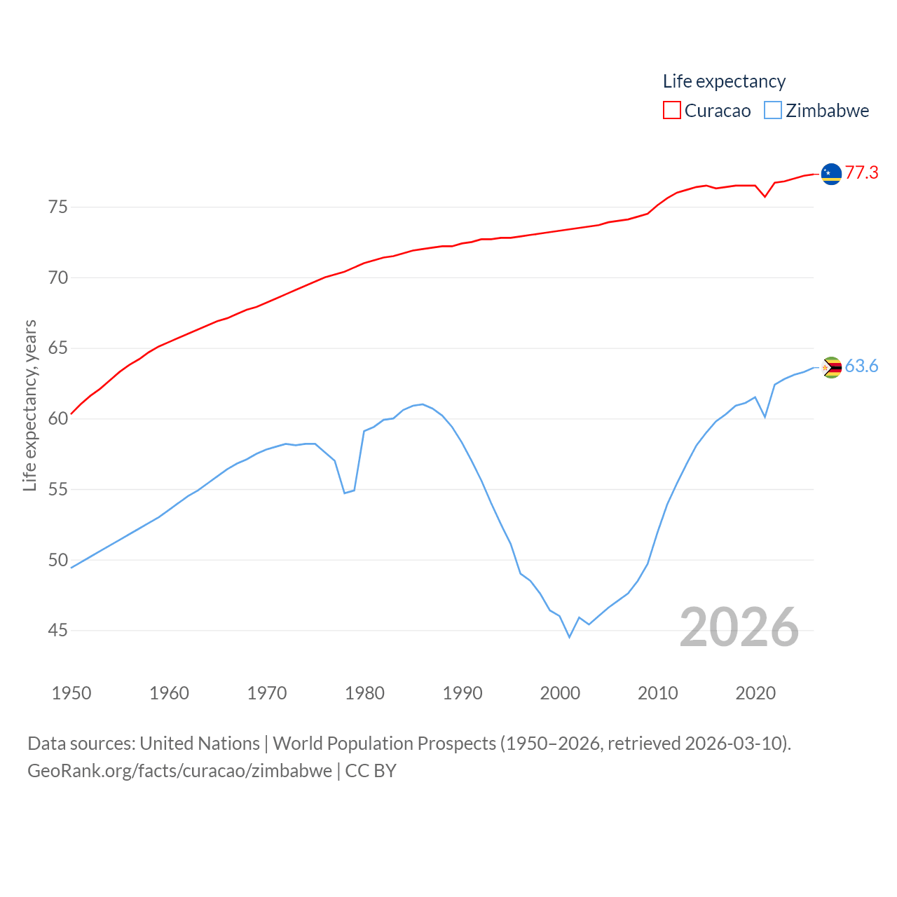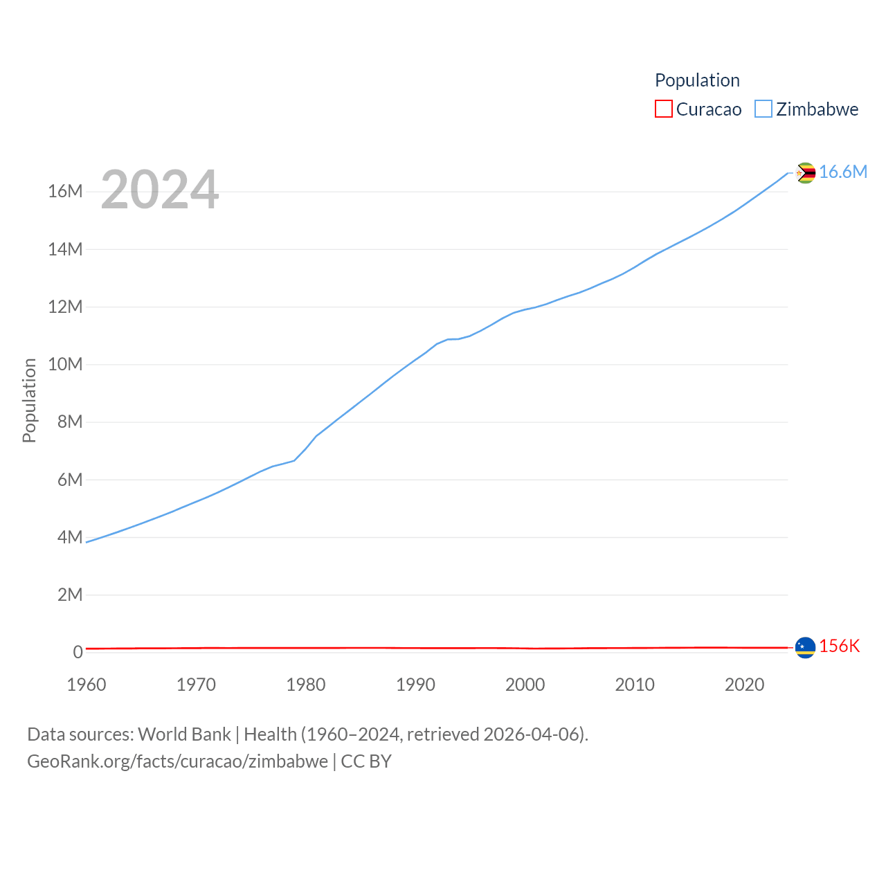 Curacao has a population of 156K (ranked 179/197), compared with 16.6M in Zimbabwe (ranked 74/197). Curacao's land area is 171.4 sq mi versus 149,364 sq mi for Zimbabwe (ranked 182nd vs. 60th).