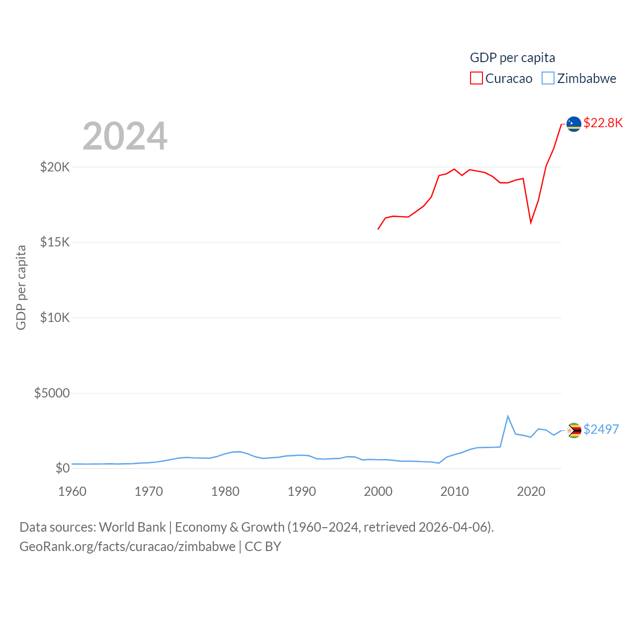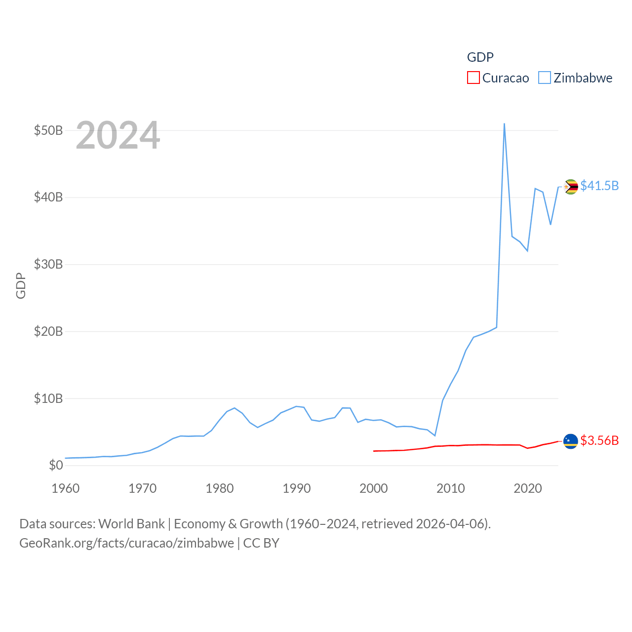 By GDP, Curacao ranks 167/197 ($3.56B) and Zimbabwe ranks 102/197 ($41.5B). By GDP per capita, Curacao ranks 56/197 ($22,833), while Zimbabwe ranks 148/197 ($2,497).