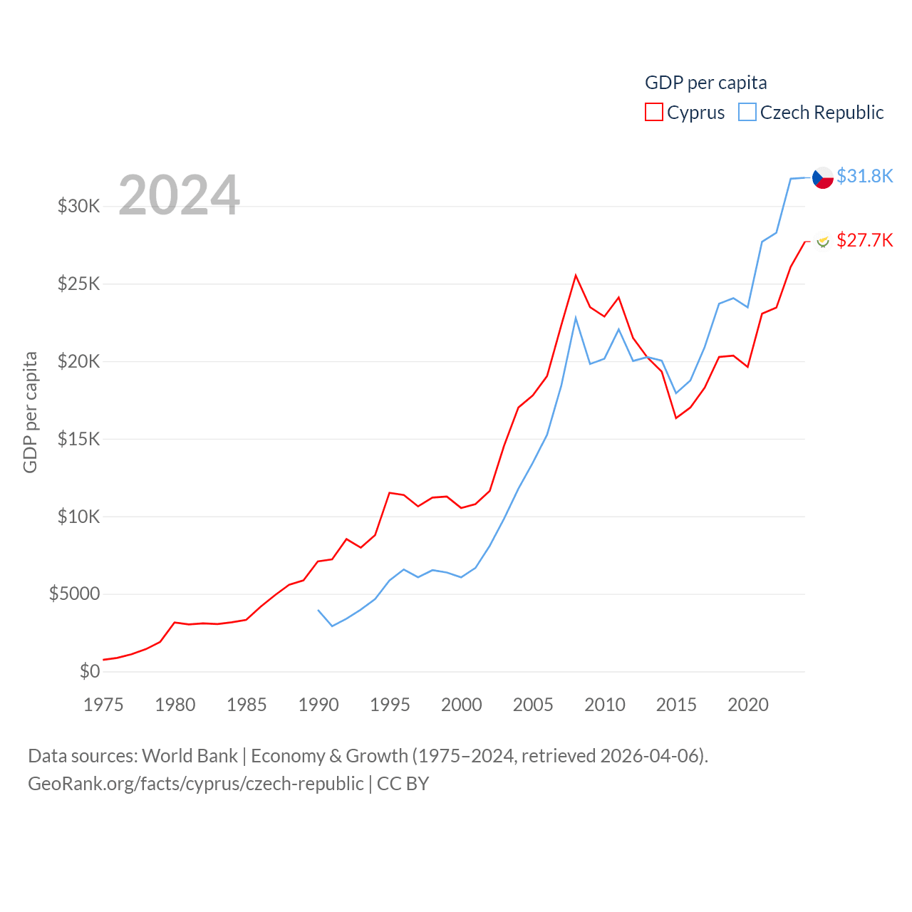By GDP, Cyprus ranks 103/197 ($37.6B) and The Czech Republic ranks 44/197 ($347B). By GDP per capita, Cyprus ranks 45/197 ($27,707), while The Czech Republic ranks 39/197 ($31,823).