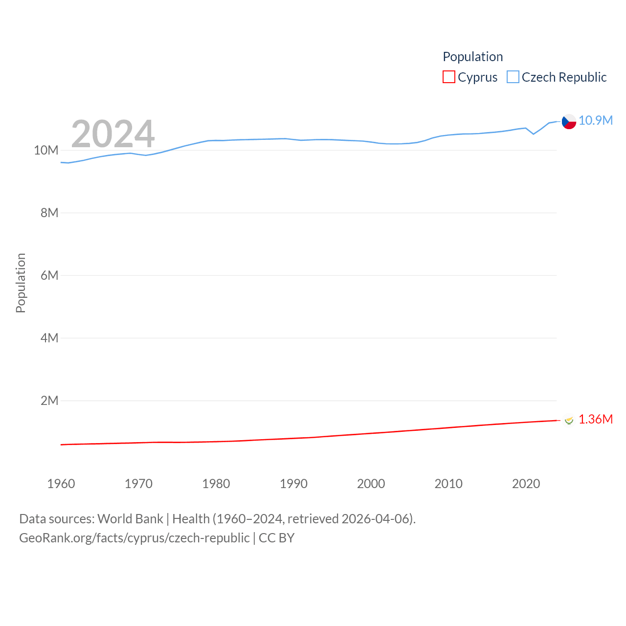 Cyprus has a population of 1.36M (ranked 155/197), compared with 10.9M in The Czech Republic (ranked 88/197). Cyprus' land area is 3,568 sq mi versus 29,794 sq mi for The Czech Republic (ranked 163rd vs. 114th).