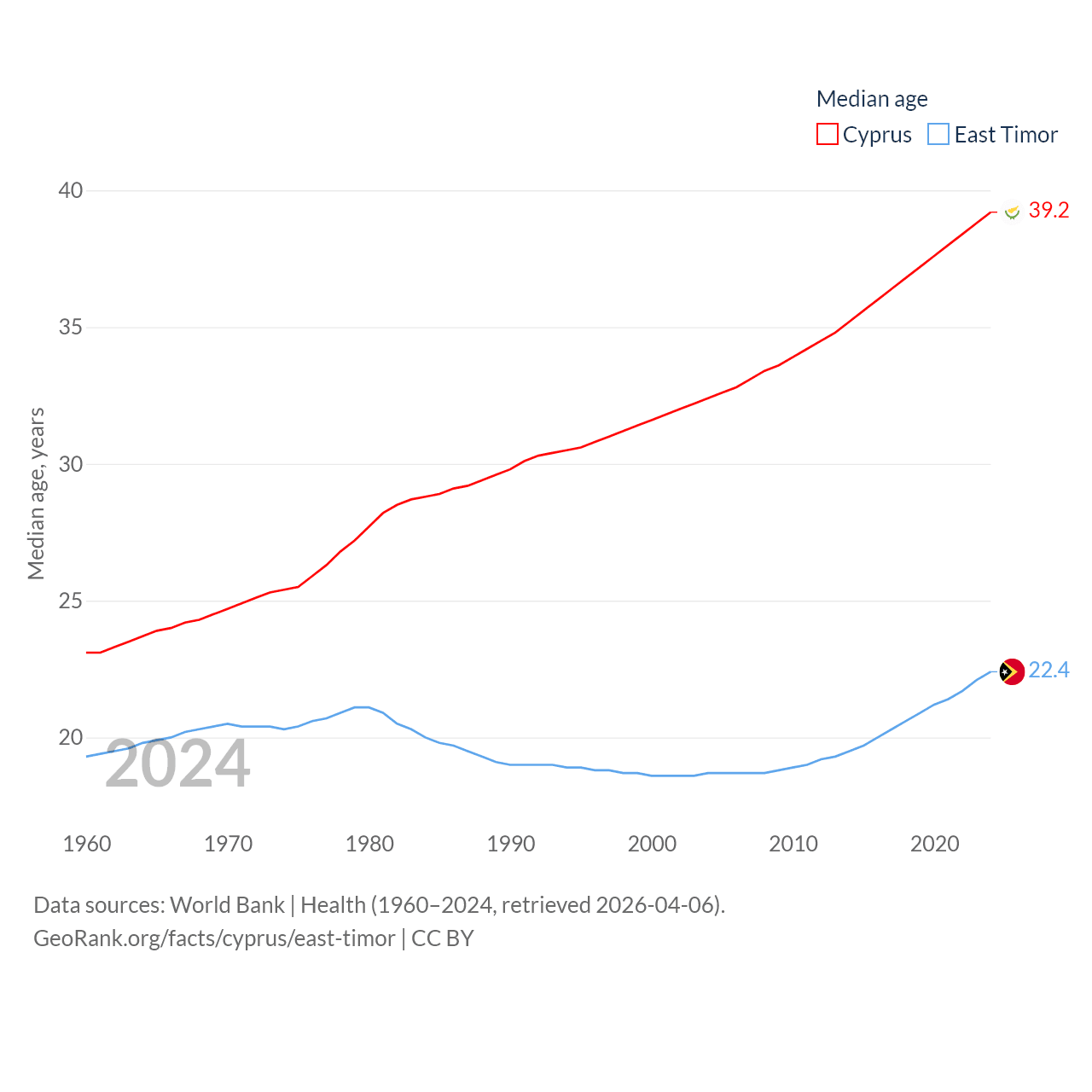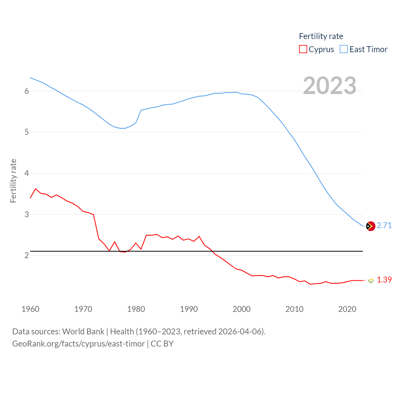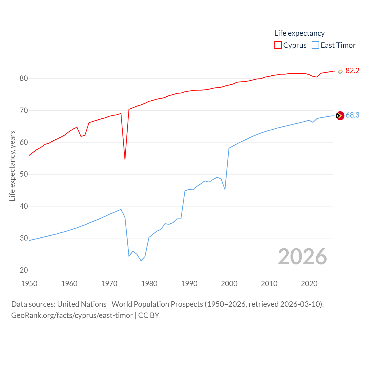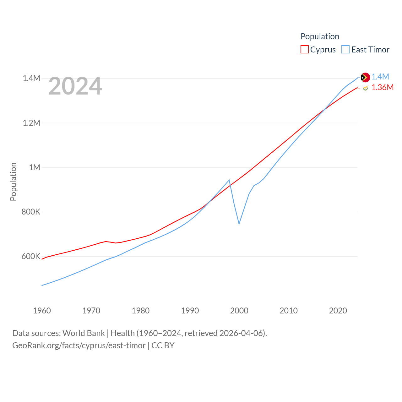 Cyprus has a population of 1.36M (ranked 155/197), compared with 1.4M in East Timor (ranked 152/197). Cyprus' land area is 3,568 sq mi versus 5,741 sq mi for East Timor (ranked 163rd vs. 155th).