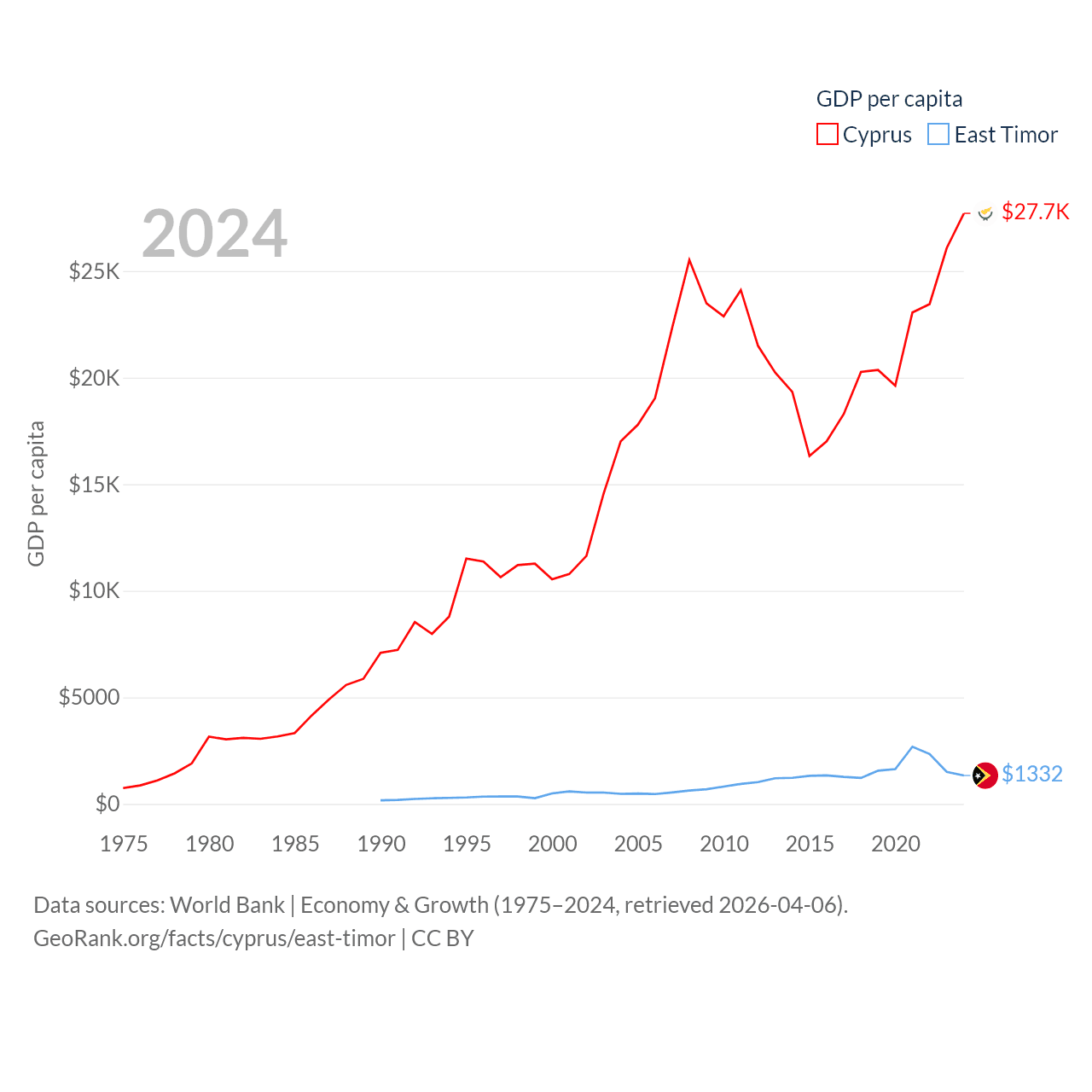 By GDP, Cyprus ranks 103/197 ($37.6B) and East Timor ranks 181/197 ($1.87B). By GDP per capita, Cyprus ranks 45/197 ($27,707), while East Timor ranks 167/197 ($1,332).
