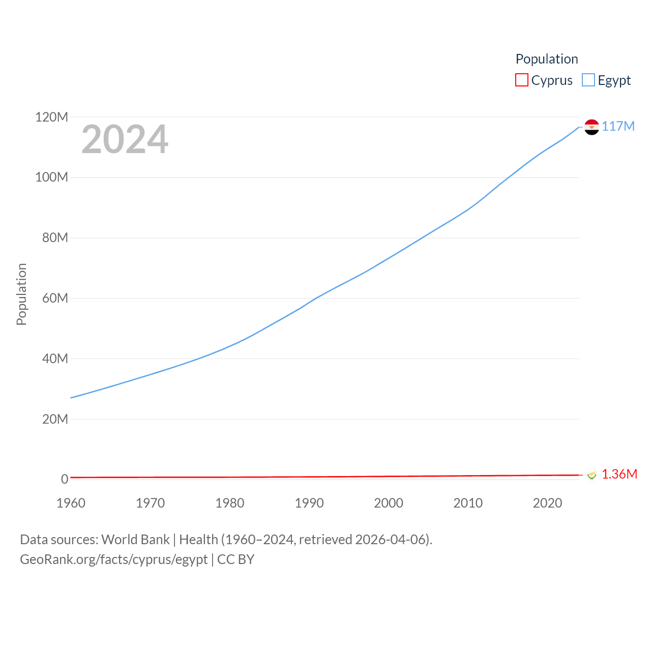 Cyprus has a population of 1.36M (ranked 155/197), compared with 117M in Egypt (ranked 13/197). Cyprus' land area is 3,568 sq mi versus 384,345 sq mi for Egypt (ranked 163rd vs. 29th).