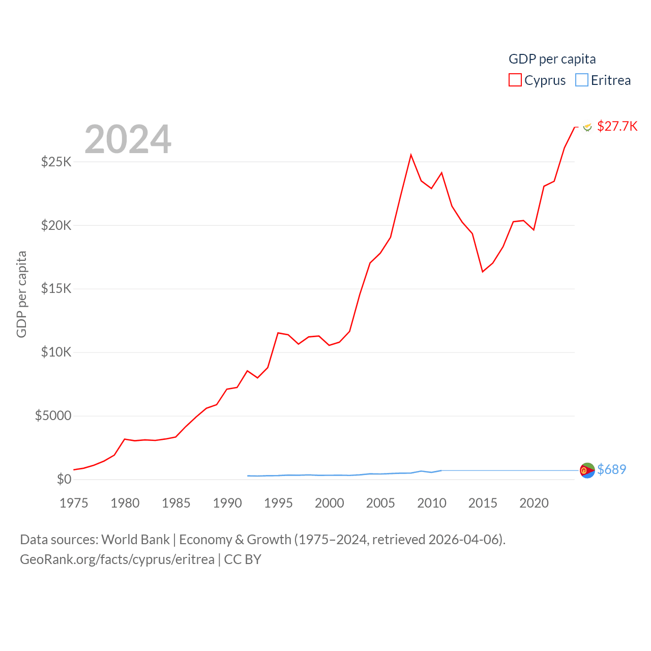 By GDP, Cyprus ranks 103/197 ($37.6B) and Eritrea ranks 179/197 ($2.07B). By GDP per capita, Cyprus ranks 45/197 ($27,707), while Eritrea ranks 188/197 ($689).