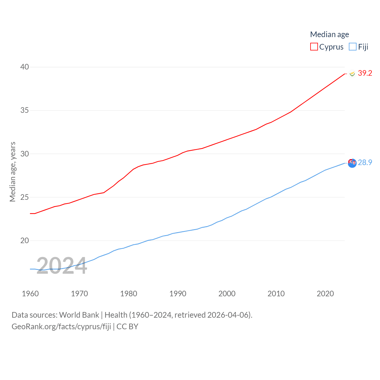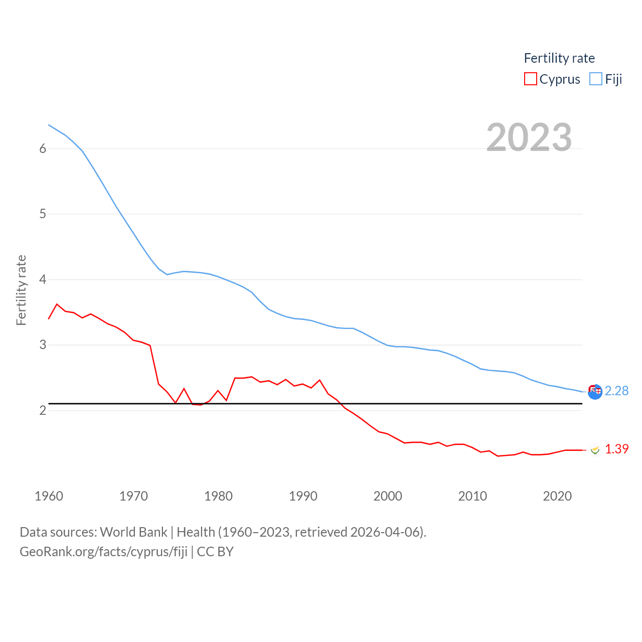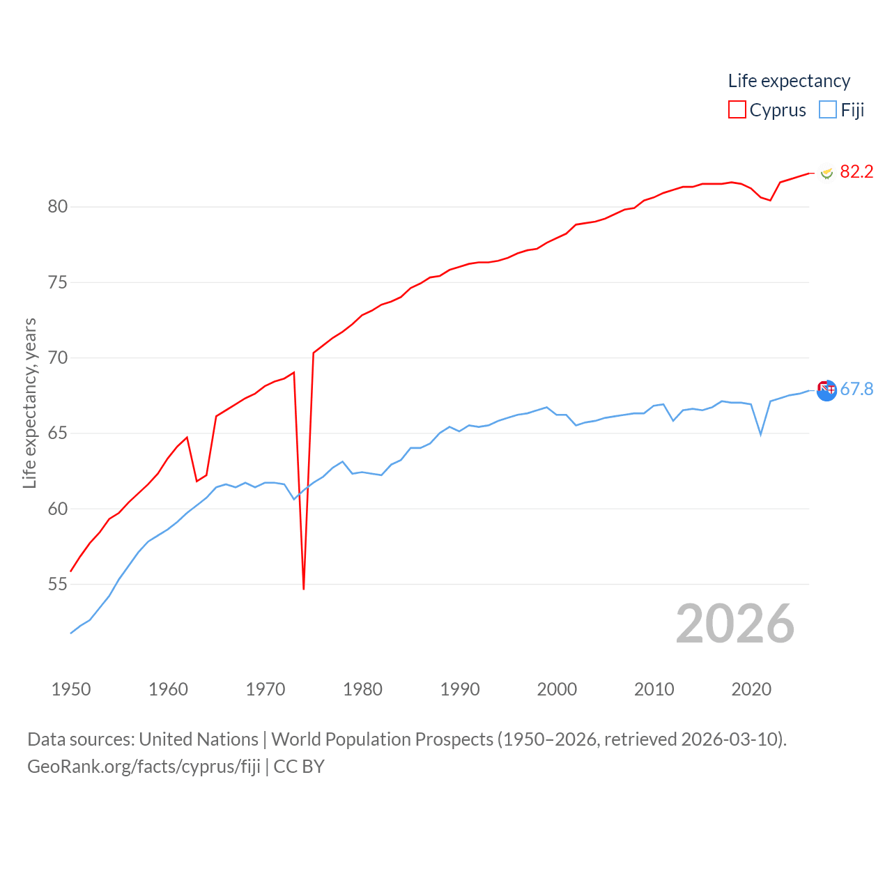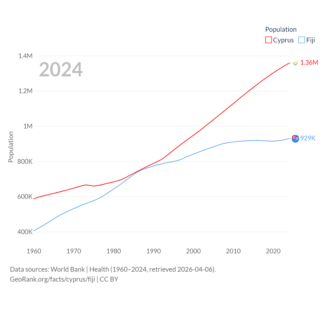 Cyprus has a population of 1.36M (ranked 155/197), compared with 929K in Fiji (ranked 159/197). Cyprus' land area is 3,568 sq mi versus 7,054 sq mi for Fiji (ranked 163rd vs. 152nd).