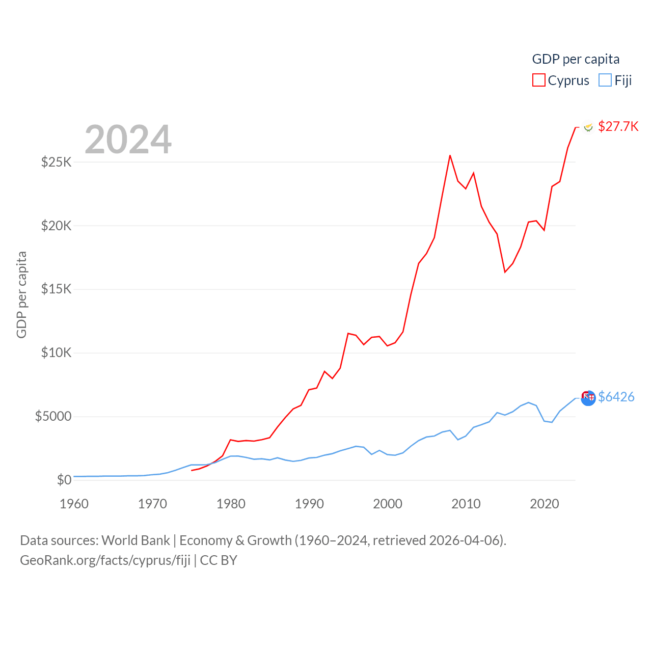 By GDP, Cyprus ranks 103/197 ($37.6B) and Fiji ranks 161/197 ($5.97B). By GDP per capita, Cyprus ranks 45/197 ($27,707), while Fiji ranks 108/197 ($6,426).