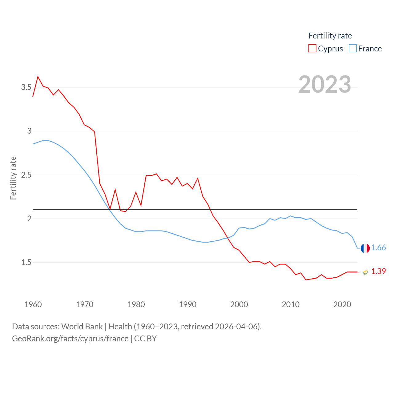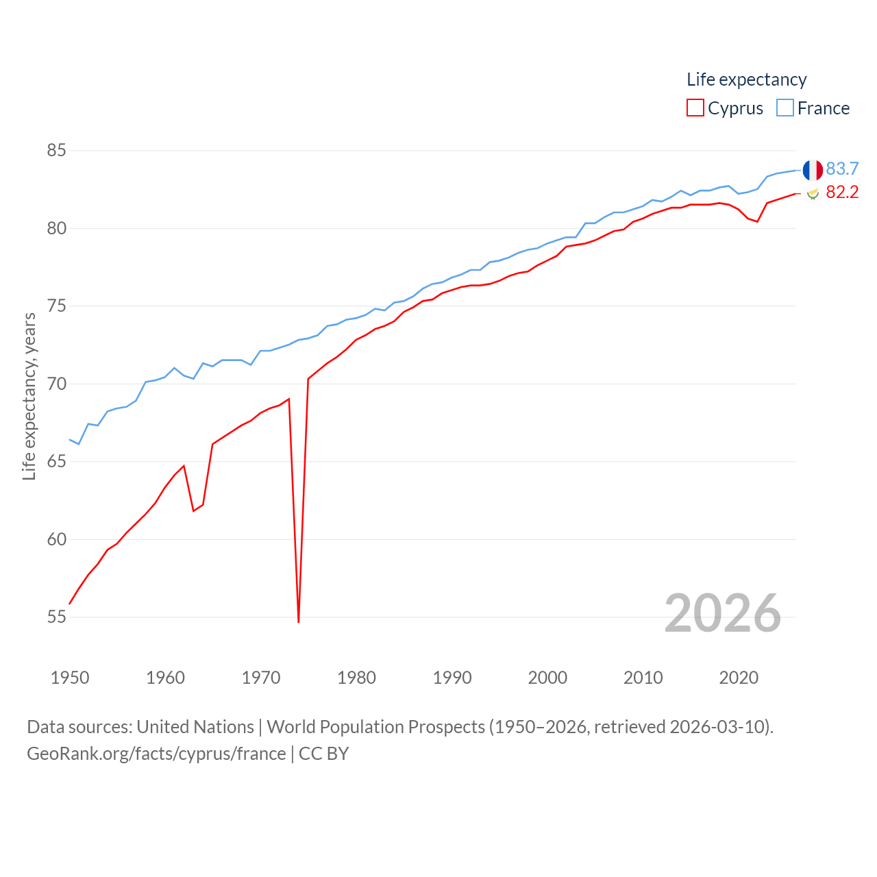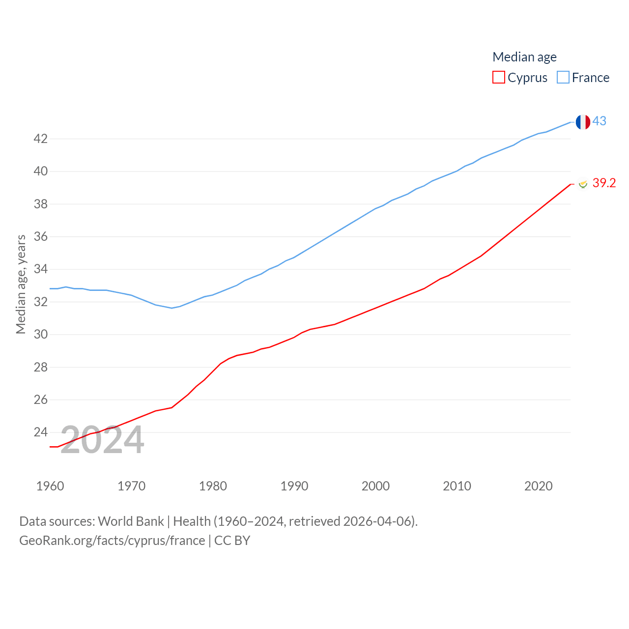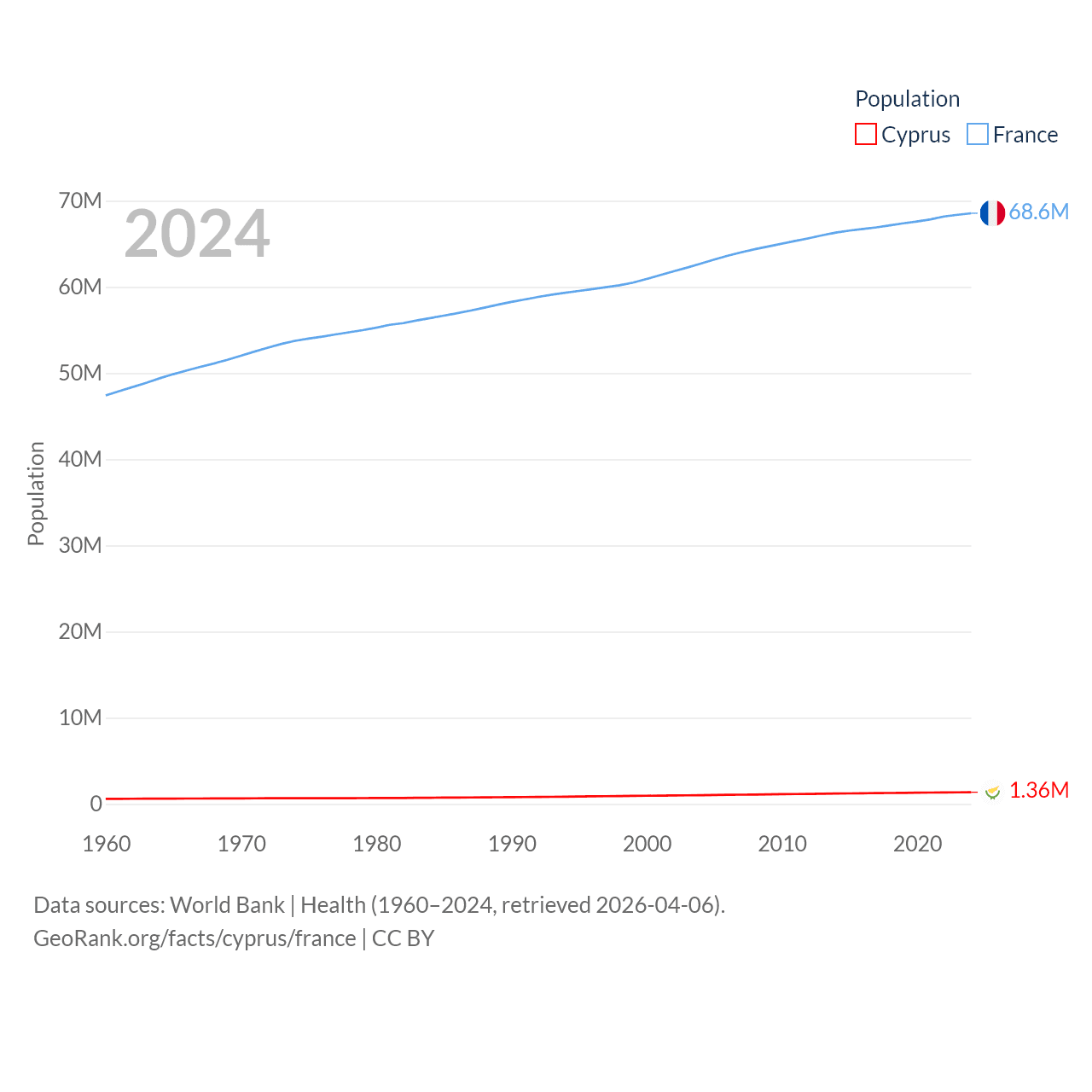 Cyprus has a population of 1.36M (ranked 155/197), compared with 68.6M in France (ranked 23/197). Cyprus' land area is 3,568 sq mi versus 208,090 sq mi for France (ranked 163rd vs. 48th).