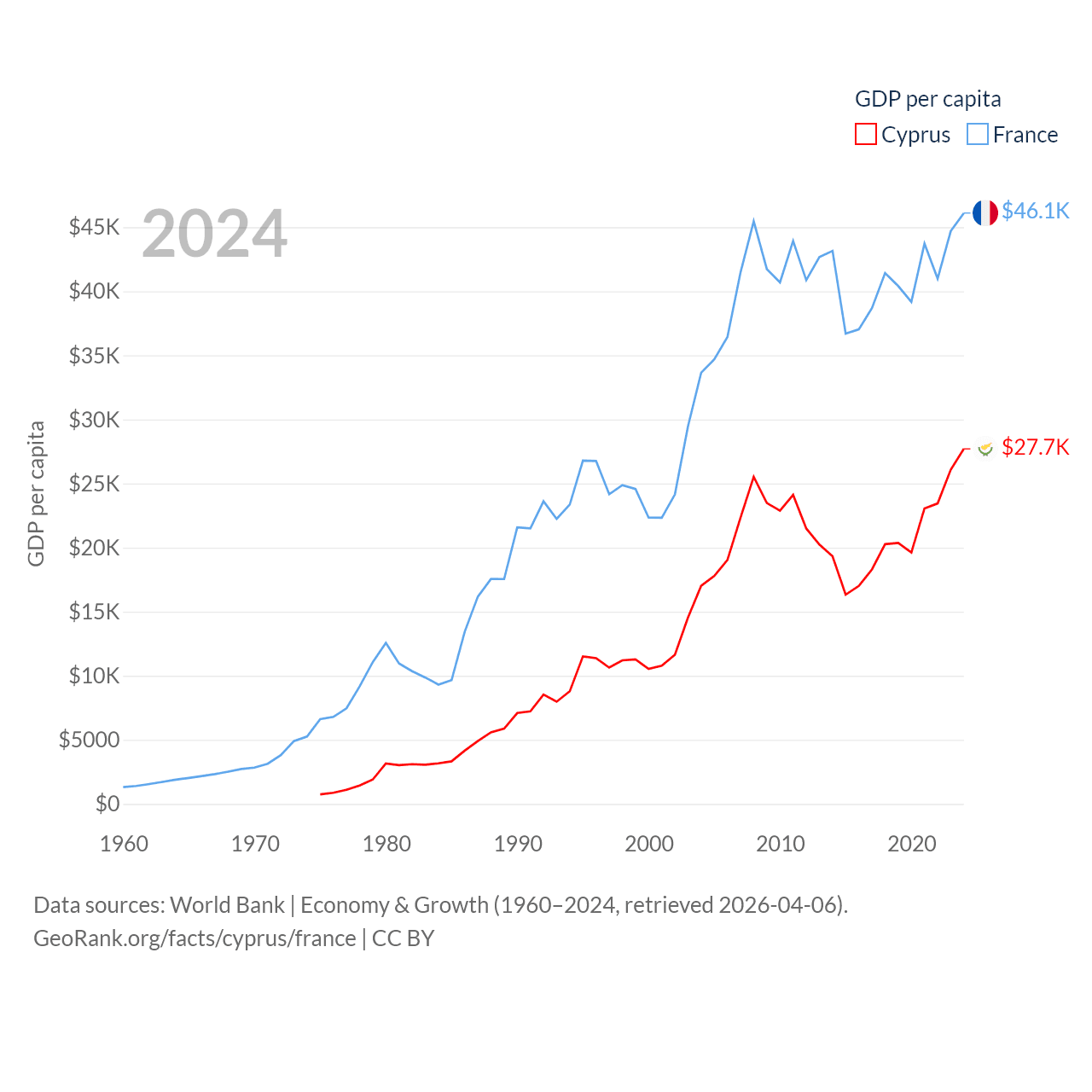 By GDP, Cyprus ranks 103/197 ($37.6B) and France ranks 7/197 ($3.16T). By GDP per capita, Cyprus ranks 45/197 ($27,707), while France ranks 27/197 ($46,103).