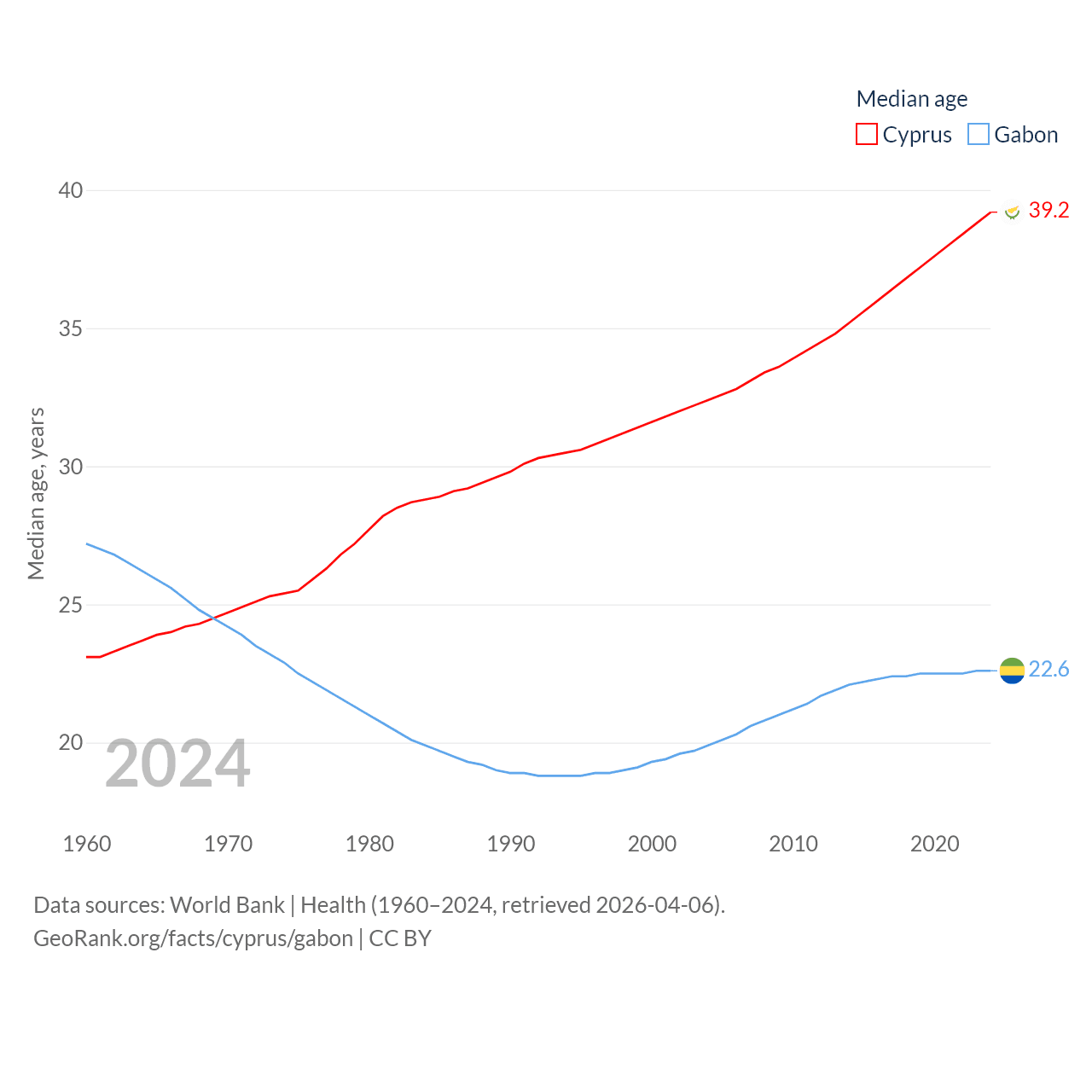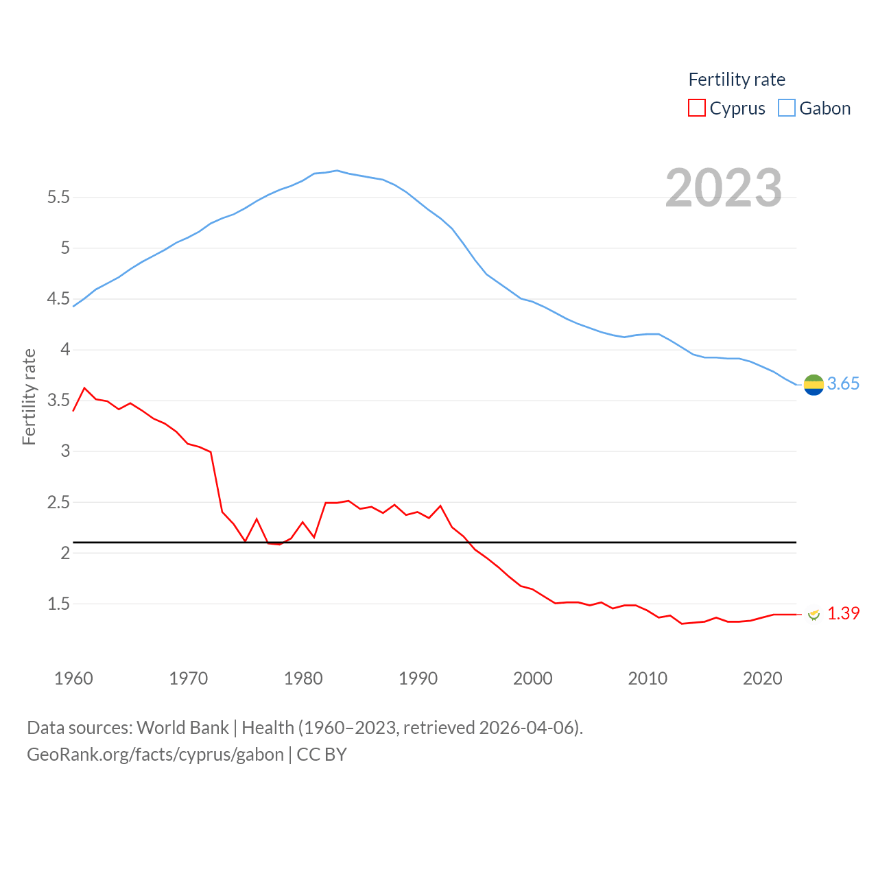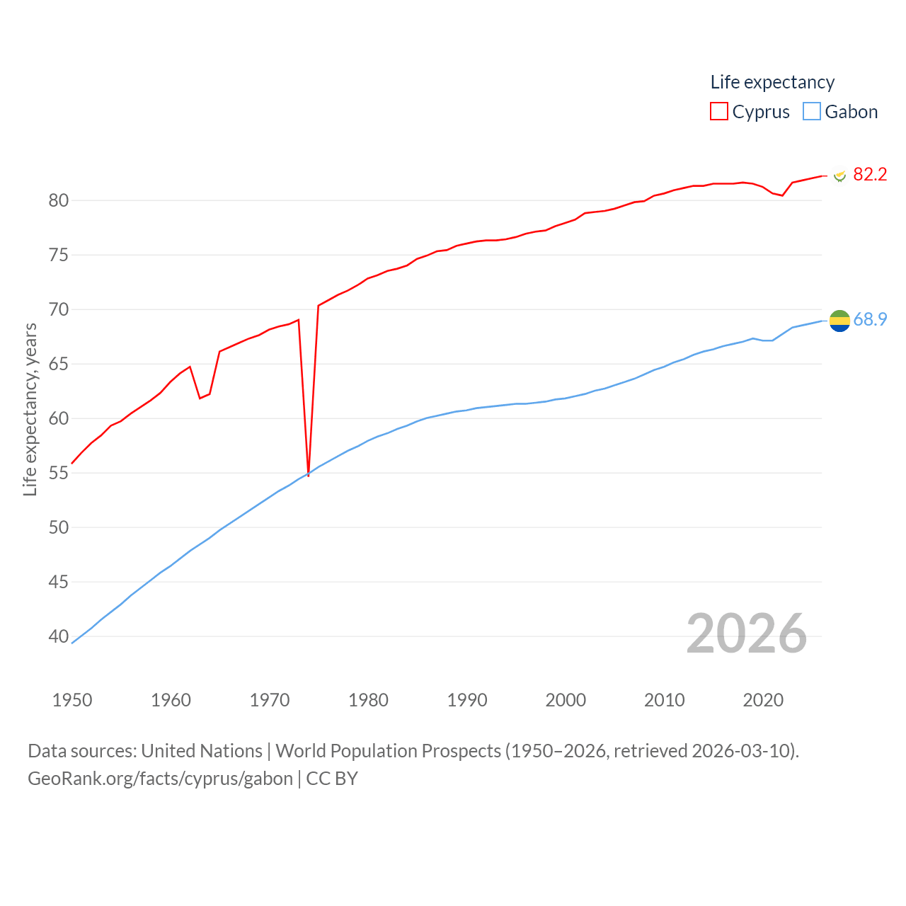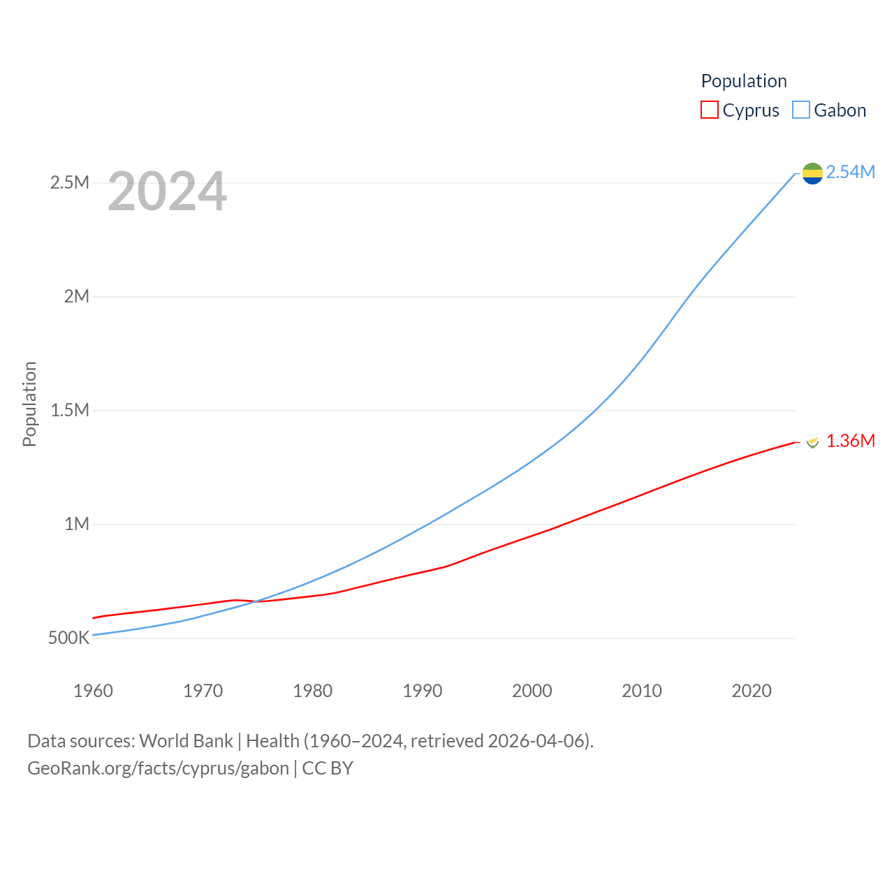 Cyprus has a population of 1.36M (ranked 155/197), compared with 2.54M in Gabon (ranked 141/197). Cyprus' land area is 3,568 sq mi versus 99,487 sq mi for Gabon (ranked 163rd vs. 75th).