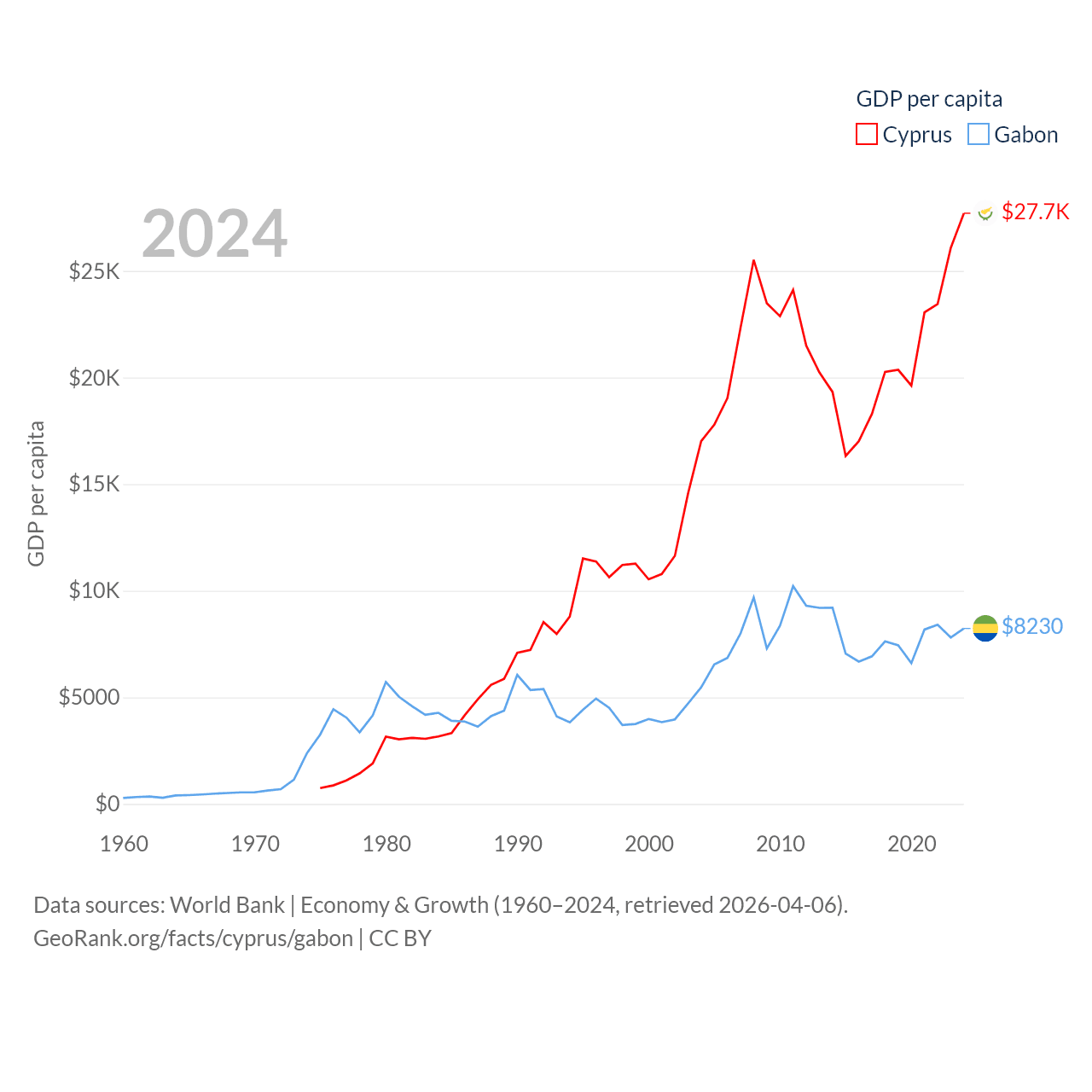 By GDP, Cyprus ranks 103/197 ($37.6B) and Gabon ranks 127/197 ($20.9B). By GDP per capita, Cyprus ranks 45/197 ($27,707), while Gabon ranks 93/197 ($8,230).