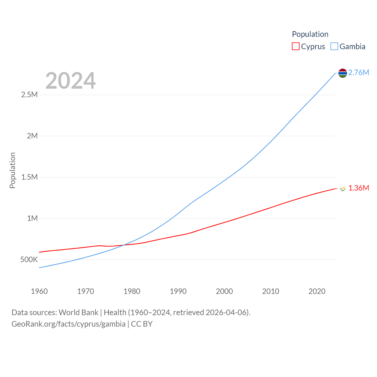 Cyprus has a population of 1.36M (ranked 155/197), compared with 2.76M in The Gambia (ranked 140/197). Cyprus' land area is 3,568 sq mi versus 3,907 sq mi for The Gambia (ranked 163rd vs. 161st).