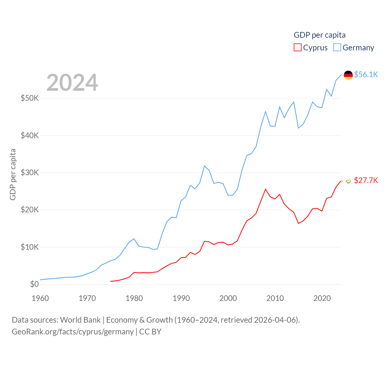 By GDP, Cyprus ranks 103/197 ($37.6B) and Germany ranks 3/197 ($4.69T). By GDP per capita, Cyprus ranks 45/197 ($27,707), while Germany ranks 19/197 ($56,104).