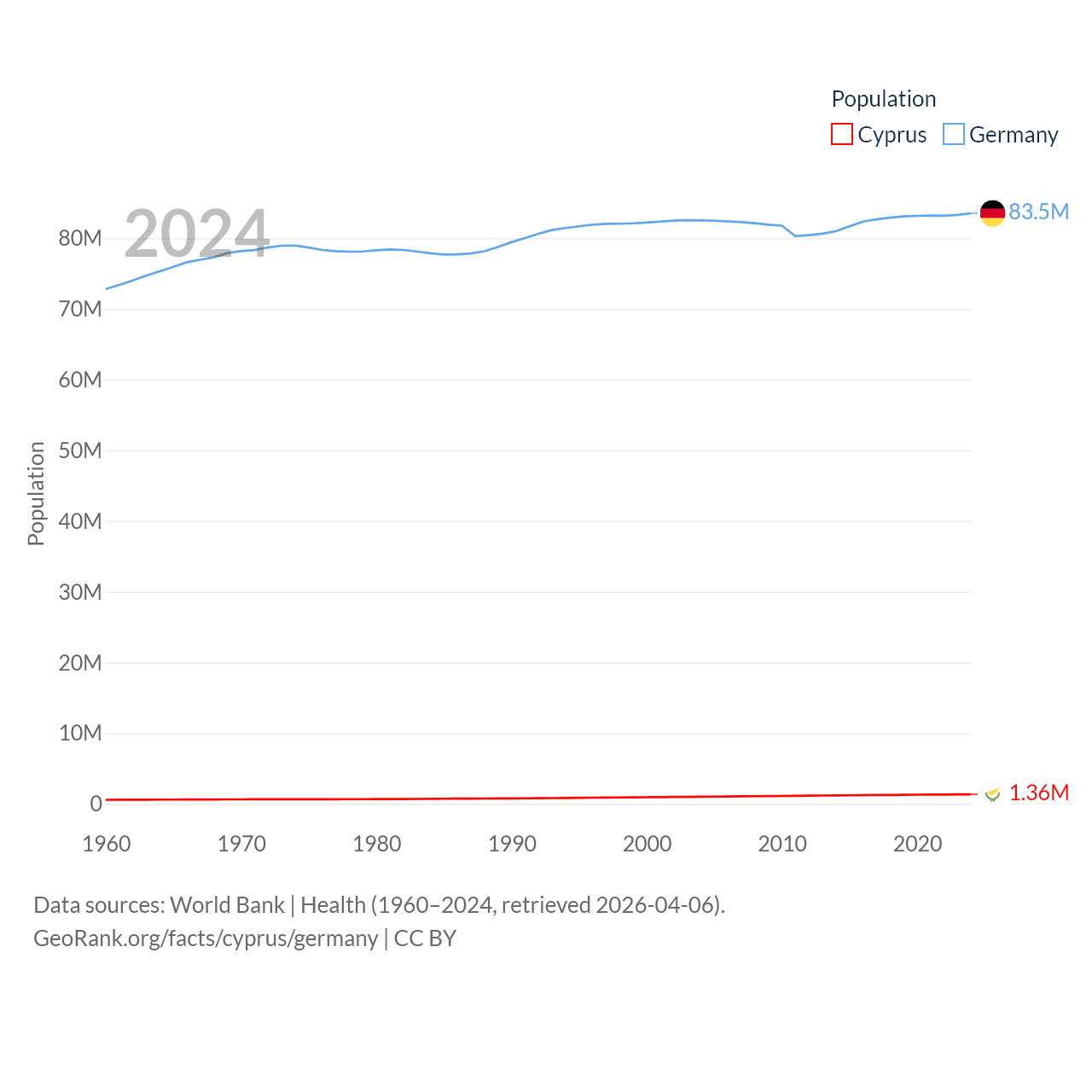 Cyprus has a population of 1.36M (ranked 155/197), compared with 83.5M in Germany (ranked 19/197). Cyprus' land area is 3,568 sq mi versus 134,916 sq mi for Germany (ranked 163rd vs. 63rd).