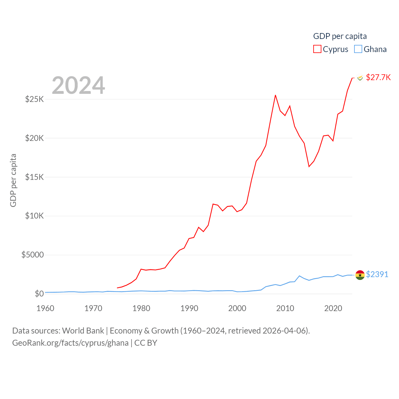 By GDP, Cyprus ranks 103/197 ($37.6B) and Ghana ranks 80/197 ($82.3B). By GDP per capita, Cyprus ranks 45/197 ($27,707), while Ghana ranks 151/197 ($2,391).