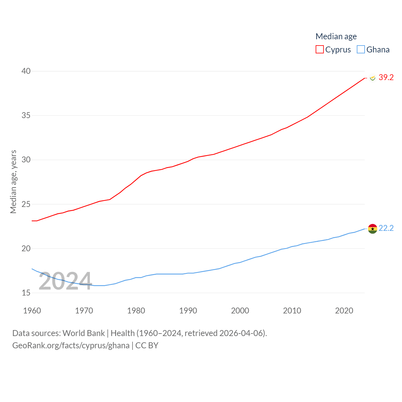 Cyprus has a population of 1.36M (ranked 155/197), compared with 34.4M in Ghana (ranked 47/197). Cyprus' land area is 3,568 sq mi versus 87,851 sq mi for Ghana (ranked 163rd vs. 81st).