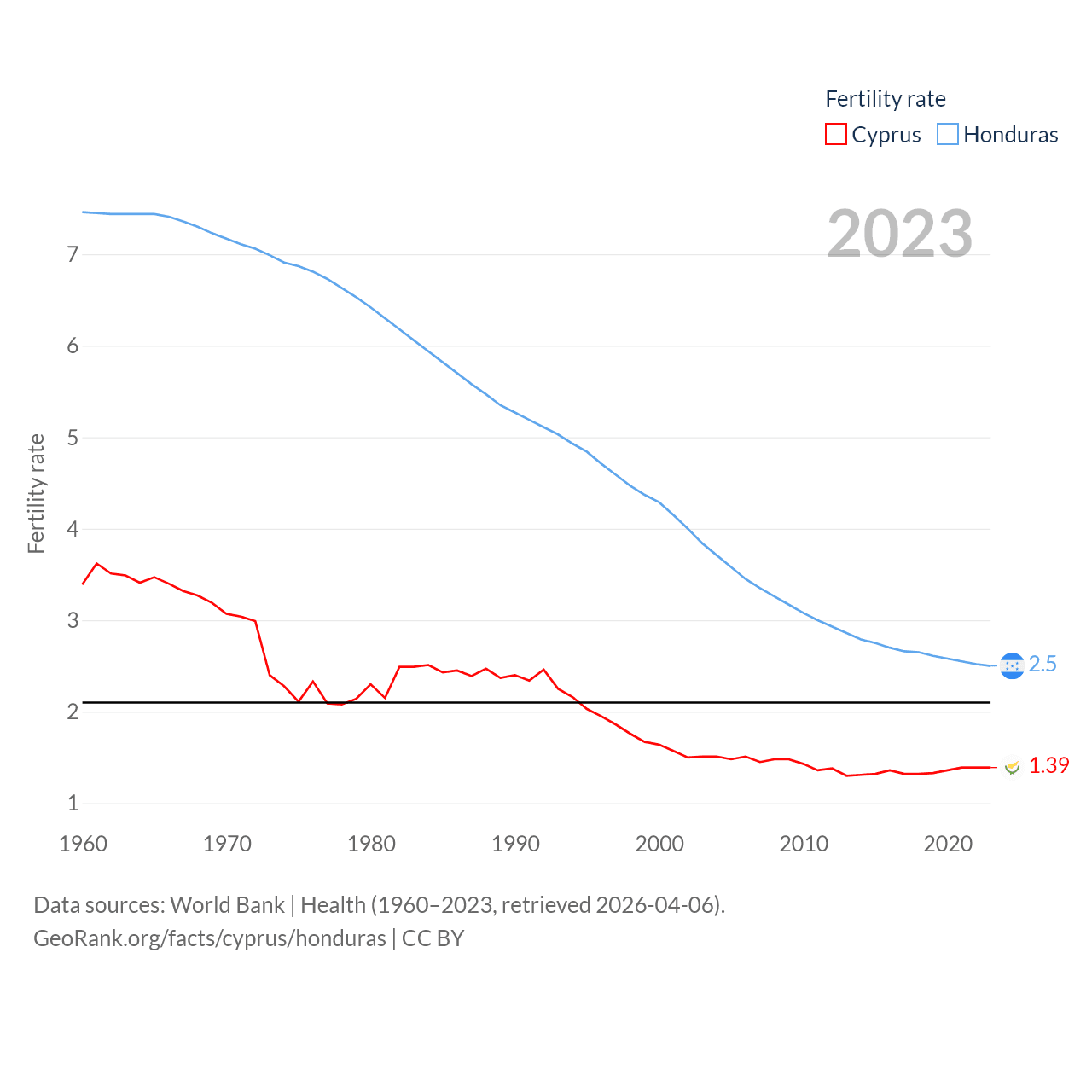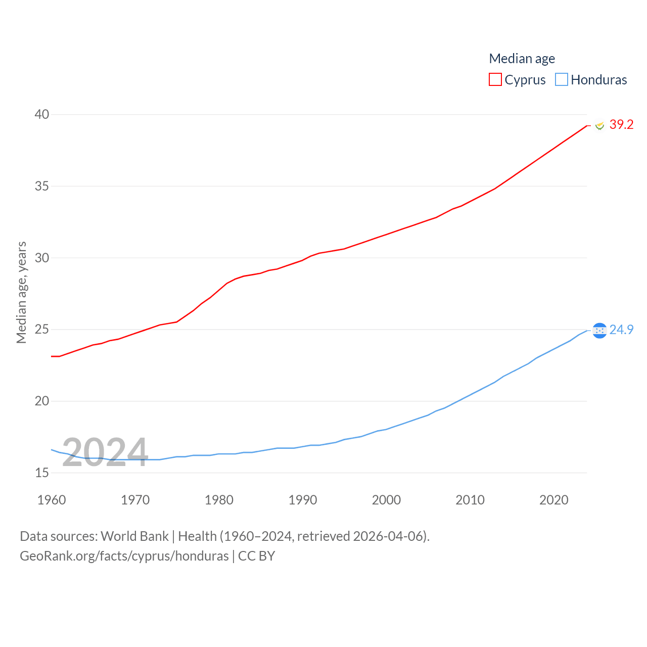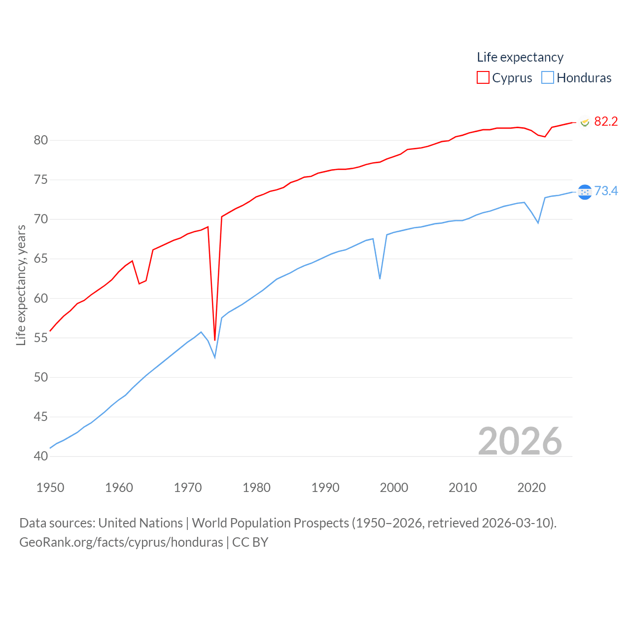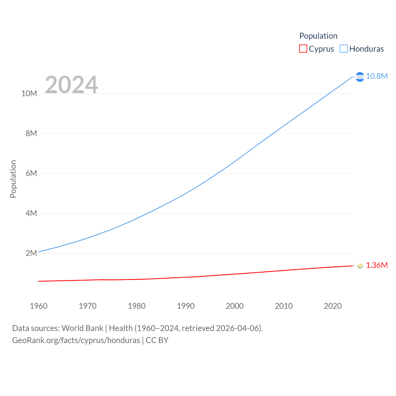 Cyprus has a population of 1.36M (ranked 155/197), compared with 10.8M in Honduras (ranked 89/197). Cyprus' land area is 3,568 sq mi versus 43,201 sq mi for Honduras (ranked 163rd vs. 100th).