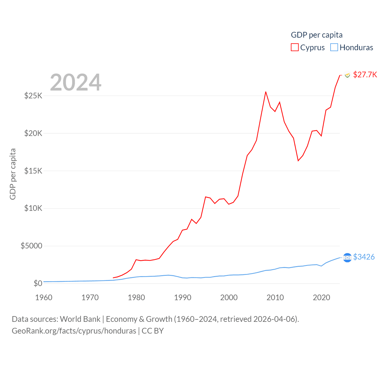 By GDP, Cyprus ranks 103/197 ($37.6B) and Honduras ranks 104/197 ($37.1B). By GDP per capita, Cyprus ranks 45/197 ($27,707), while Honduras ranks 136/197 ($3,426).