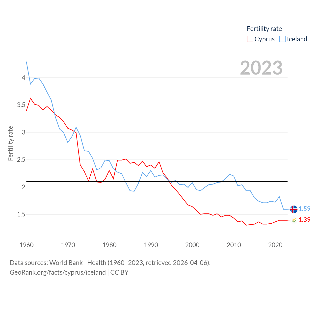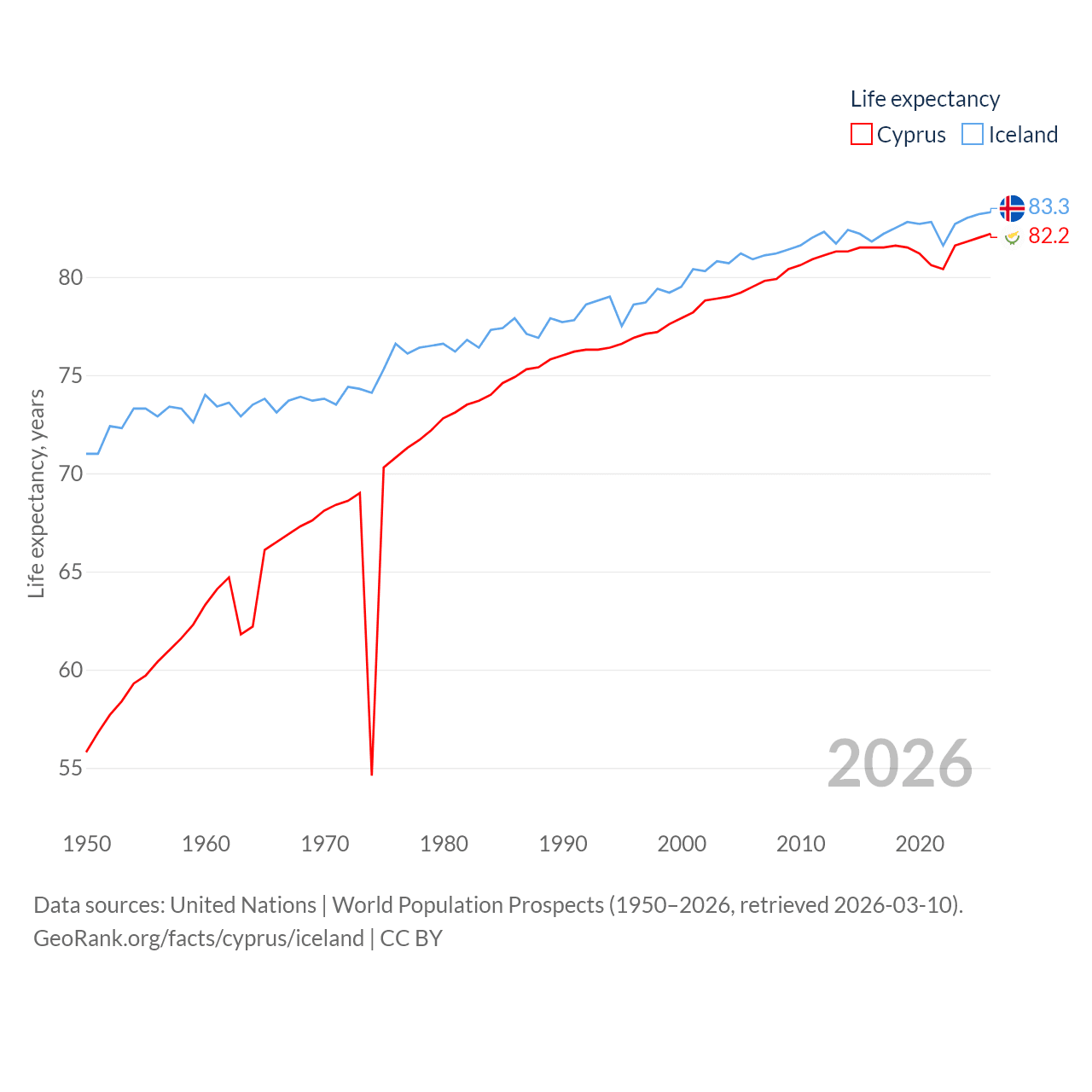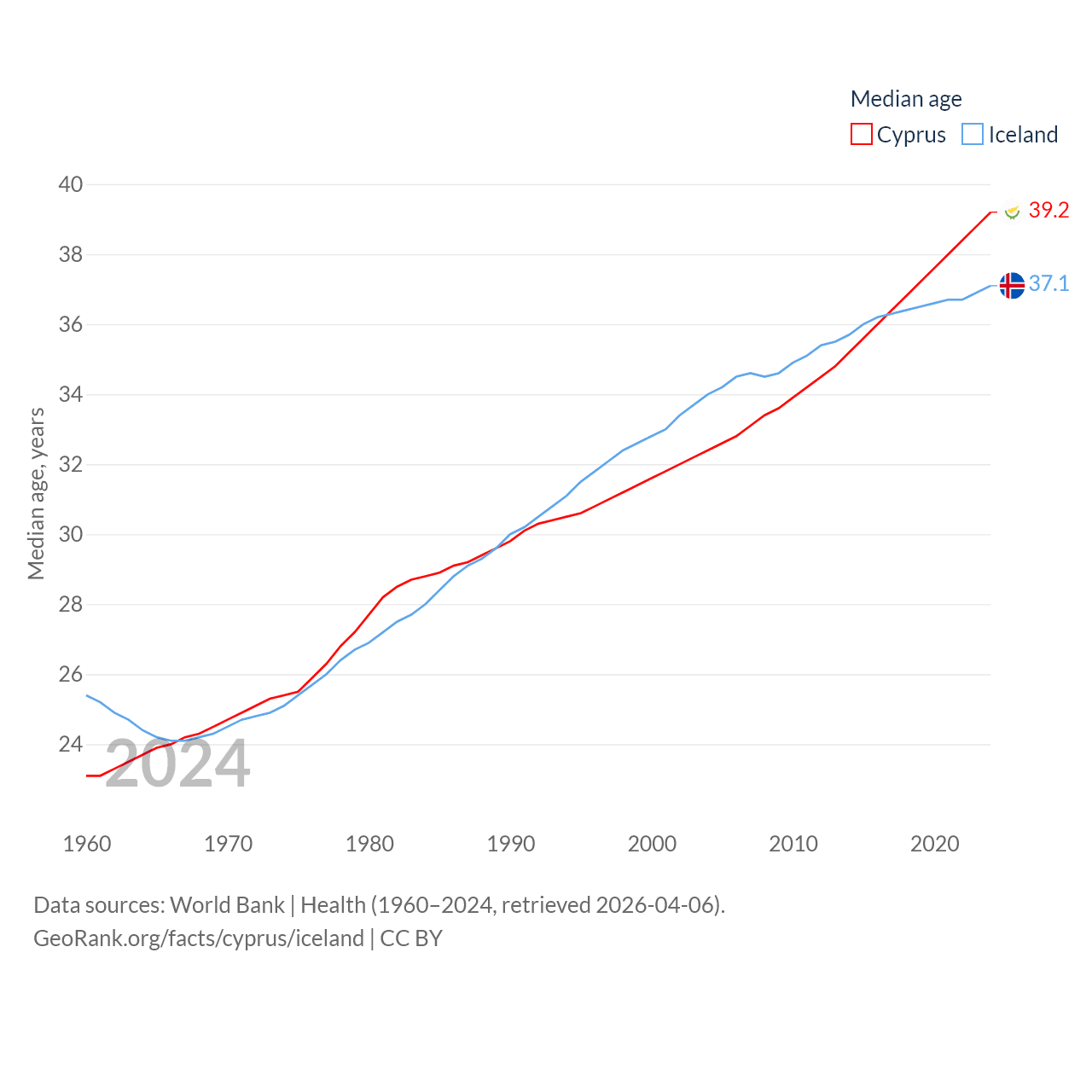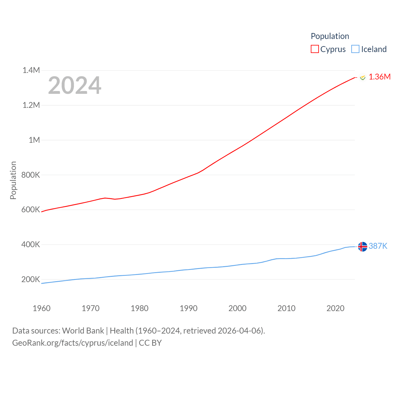 Cyprus has a population of 1.36M (ranked 155/197), compared with 387K in Iceland (ranked 173/197). Cyprus' land area is 3,568 sq mi versus 38,931 sq mi for Iceland (ranked 163rd vs. 104th).