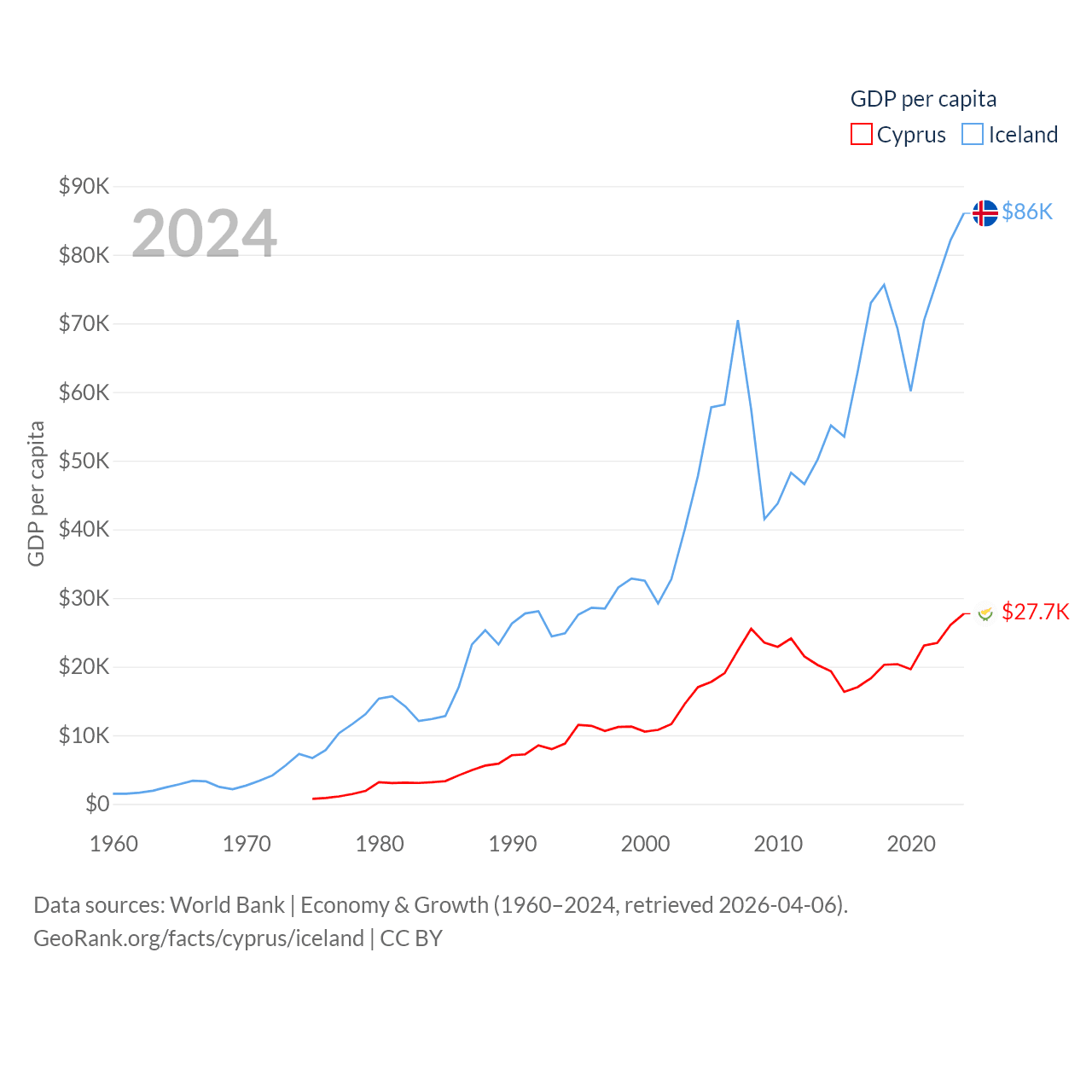By GDP, Cyprus ranks 103/197 ($37.6B) and Iceland ranks 108/197 ($33.3B). By GDP per capita, Cyprus ranks 45/197 ($27,707), while Iceland ranks 9/197 ($86,041).