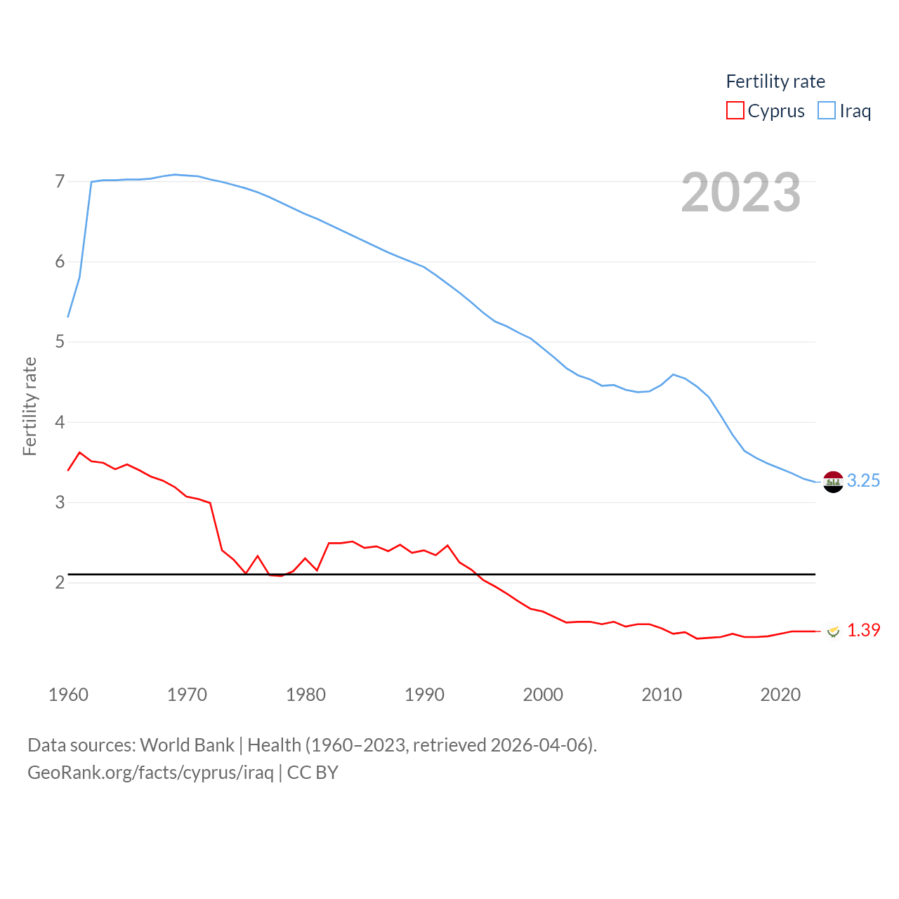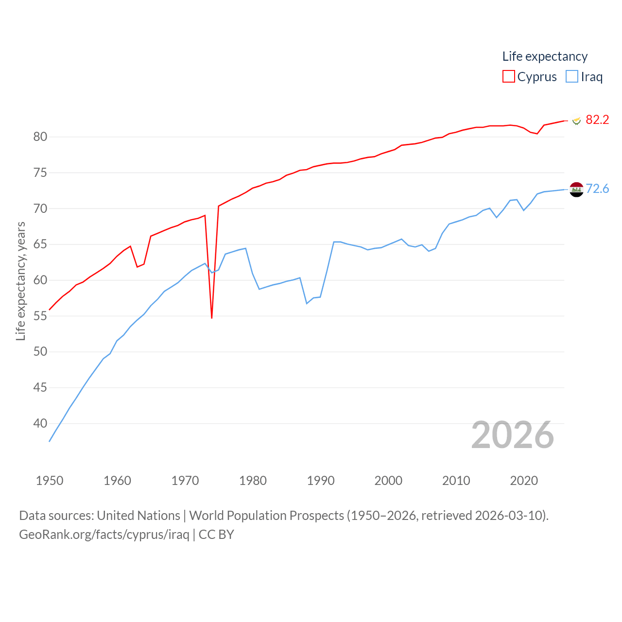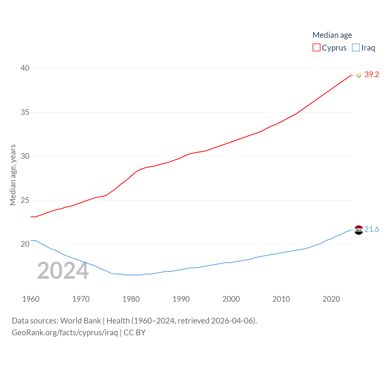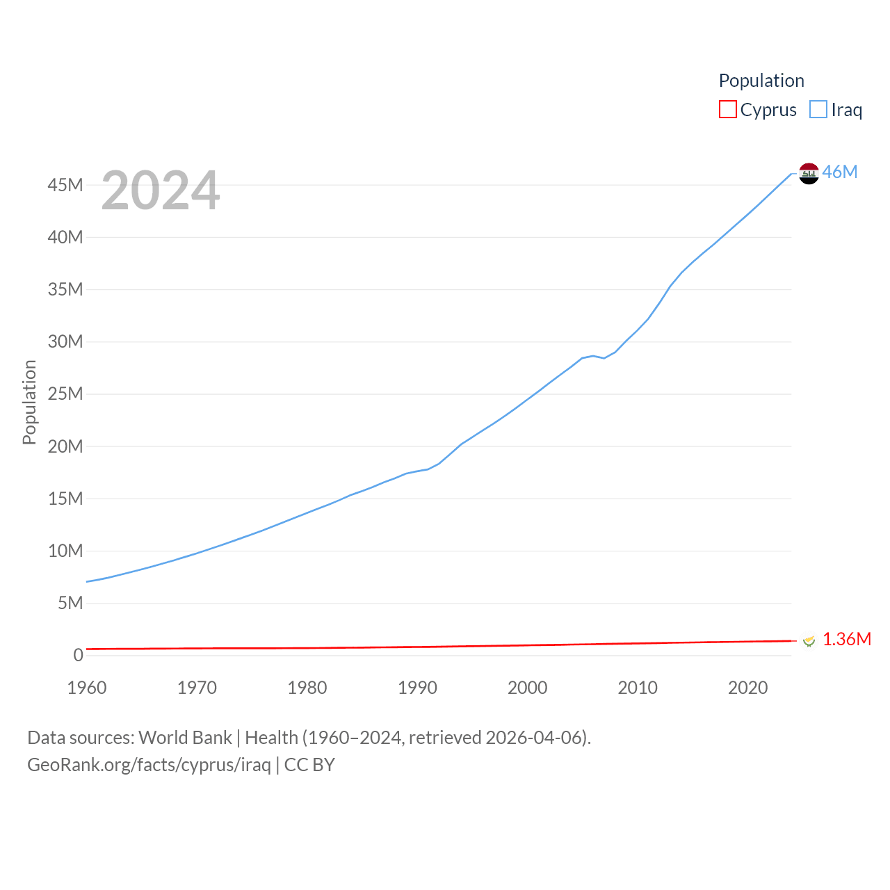 Cyprus has a population of 1.36M (ranked 155/197), compared with 46M in Iraq (ranked 34/197). Cyprus' land area is 3,568 sq mi versus 167,619 sq mi for Iraq (ranked 163rd vs. 57th).