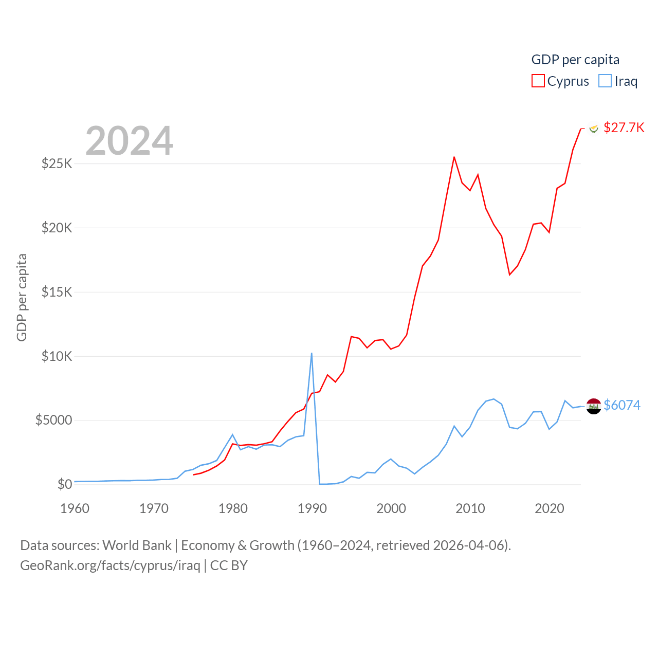 By GDP, Cyprus ranks 103/197 ($37.6B) and Iraq ranks 50/197 ($280B). By GDP per capita, Cyprus ranks 45/197 ($27,707), while Iraq ranks 113/197 ($6,074).