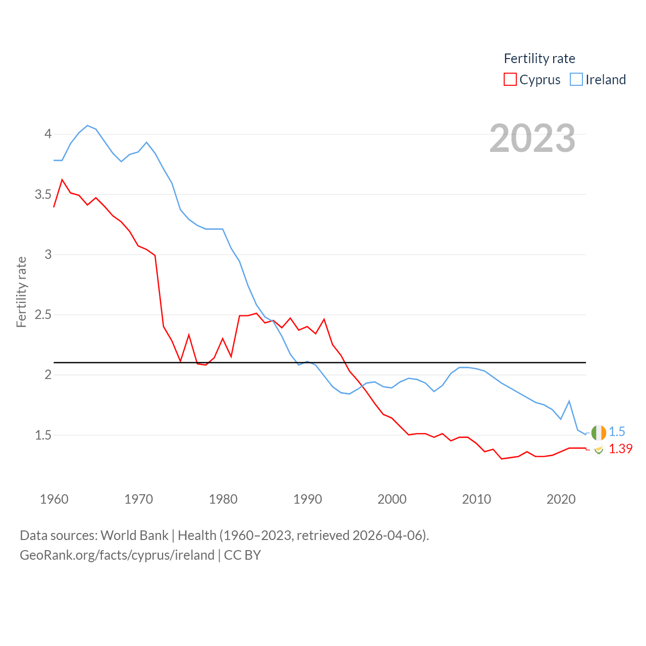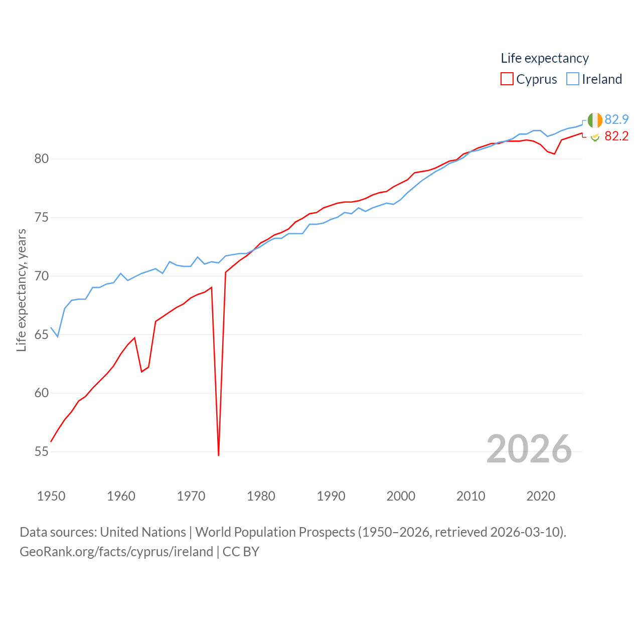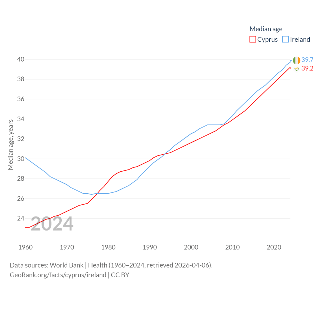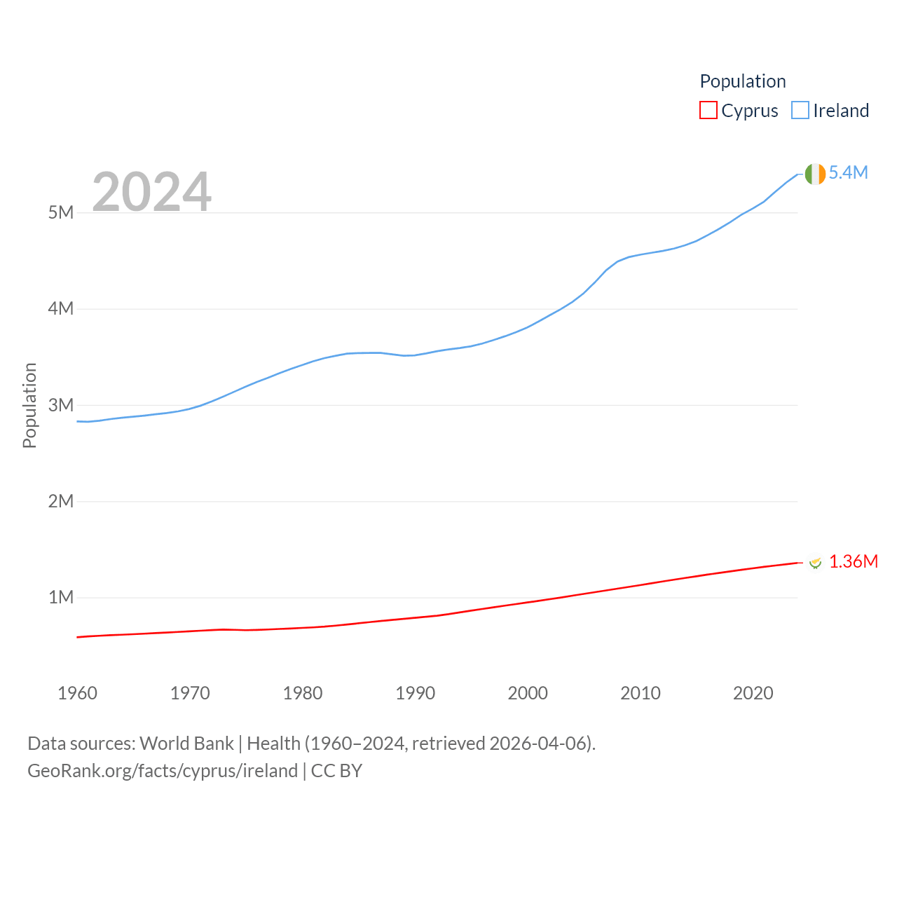 Cyprus has a population of 1.36M (ranked 155/197), compared with 5.4M in Ireland (ranked 120/197). Cyprus' land area is 3,568 sq mi versus 26,599 sq mi for Ireland (ranked 163rd vs. 119th).