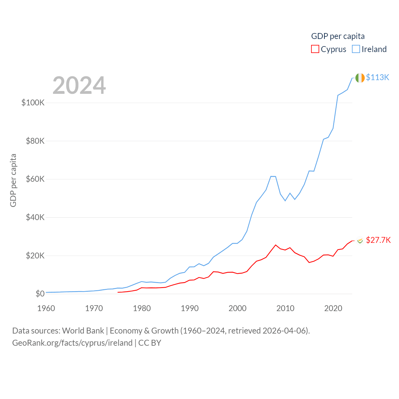 By GDP, Cyprus ranks 103/197 ($37.6B) and Ireland ranks 25/197 ($609B). By GDP per capita, Cyprus ranks 45/197 ($27,707), while Ireland ranks 4/197 ($112,895).
