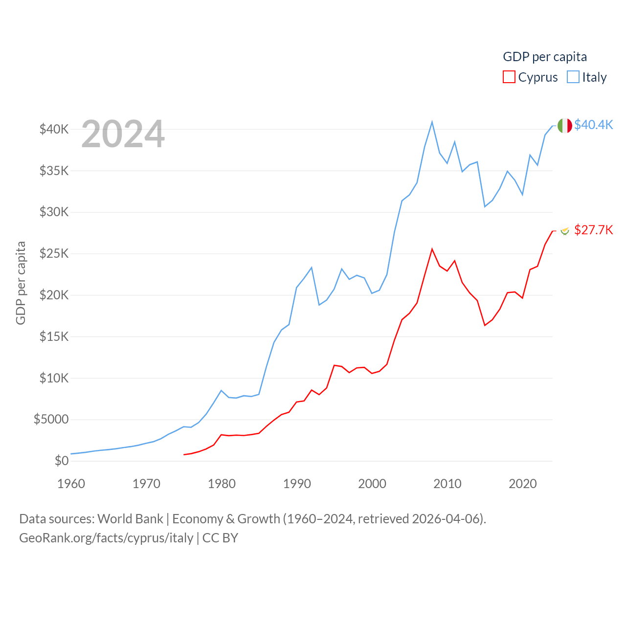 By GDP, Cyprus ranks 103/197 ($37.6B) and Italy ranks 8/197 ($2.38T). By GDP per capita, Cyprus ranks 45/197 ($27,707), while Italy ranks 29/197 ($40,385).