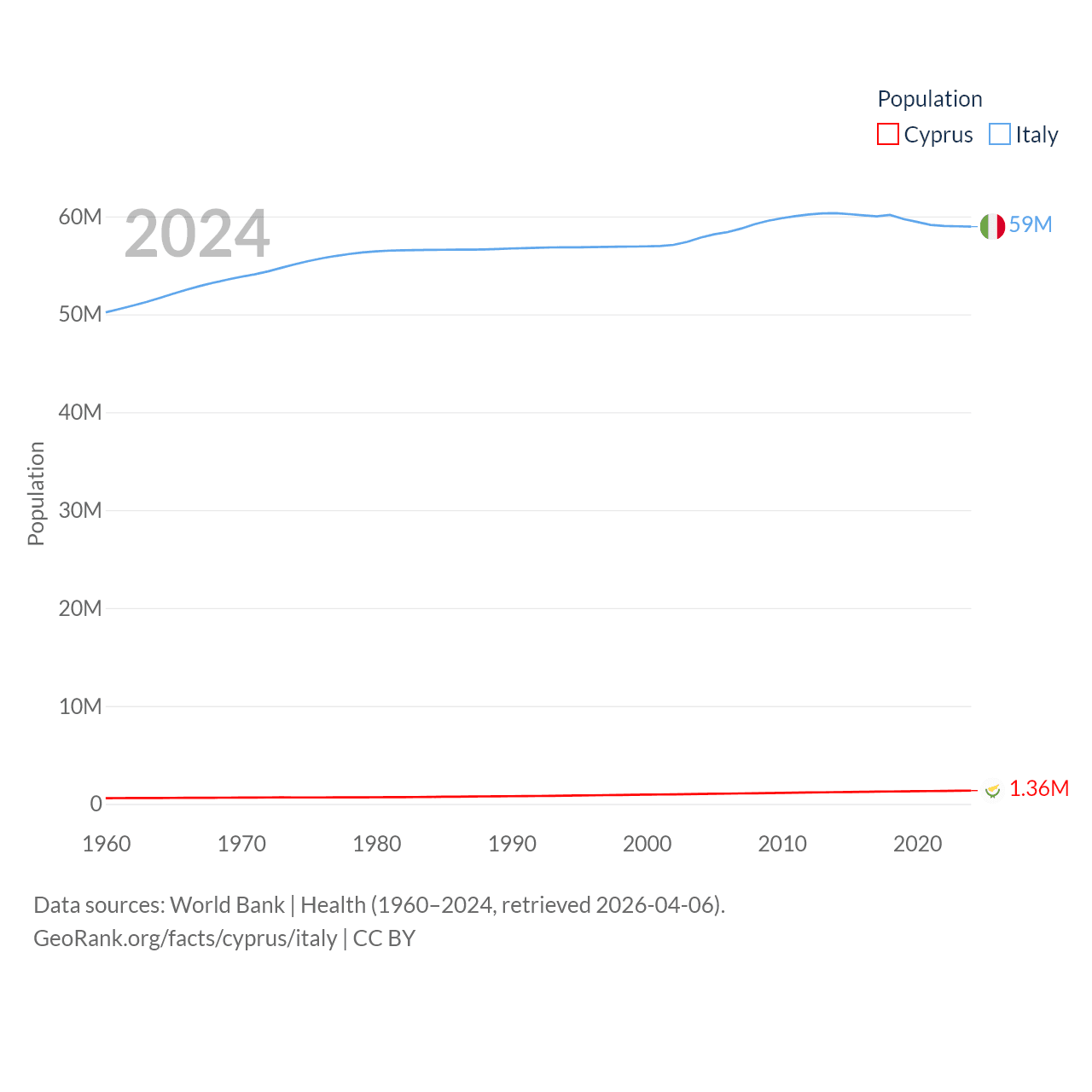 Cyprus has a population of 1.36M (ranked 155/197), compared with 59M in Italy (ranked 25/197). Cyprus' land area is 3,568 sq mi versus 114,178 sq mi for Italy (ranked 163rd vs. 72nd).