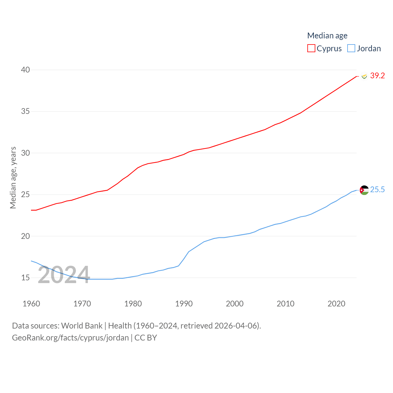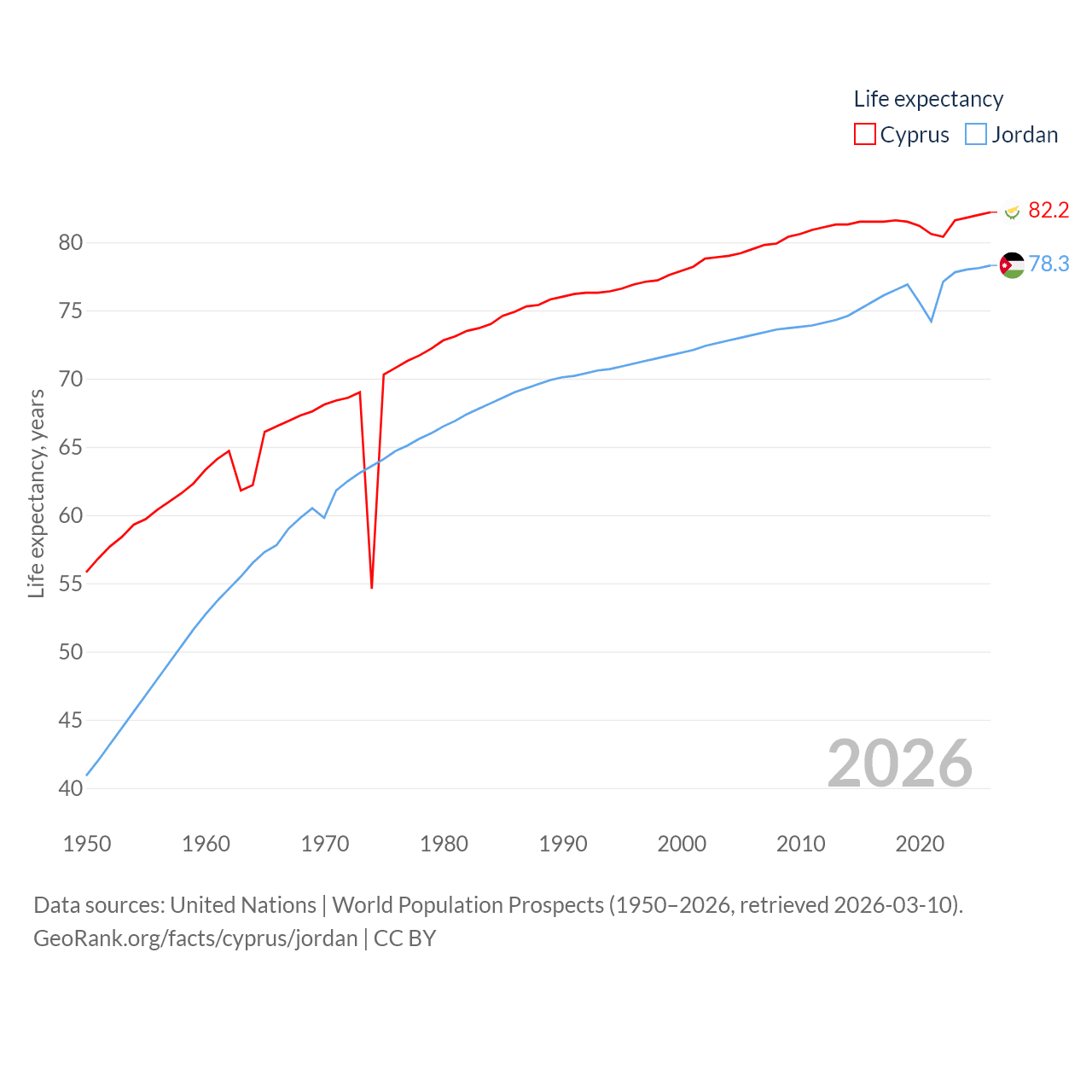 Cyprus has a population of 1.36M (ranked 155/197), compared with 11.6M in Jordan (ranked 84/197). Cyprus' land area is 3,568 sq mi versus 34,284 sq mi for Jordan (ranked 163rd vs. 110th).