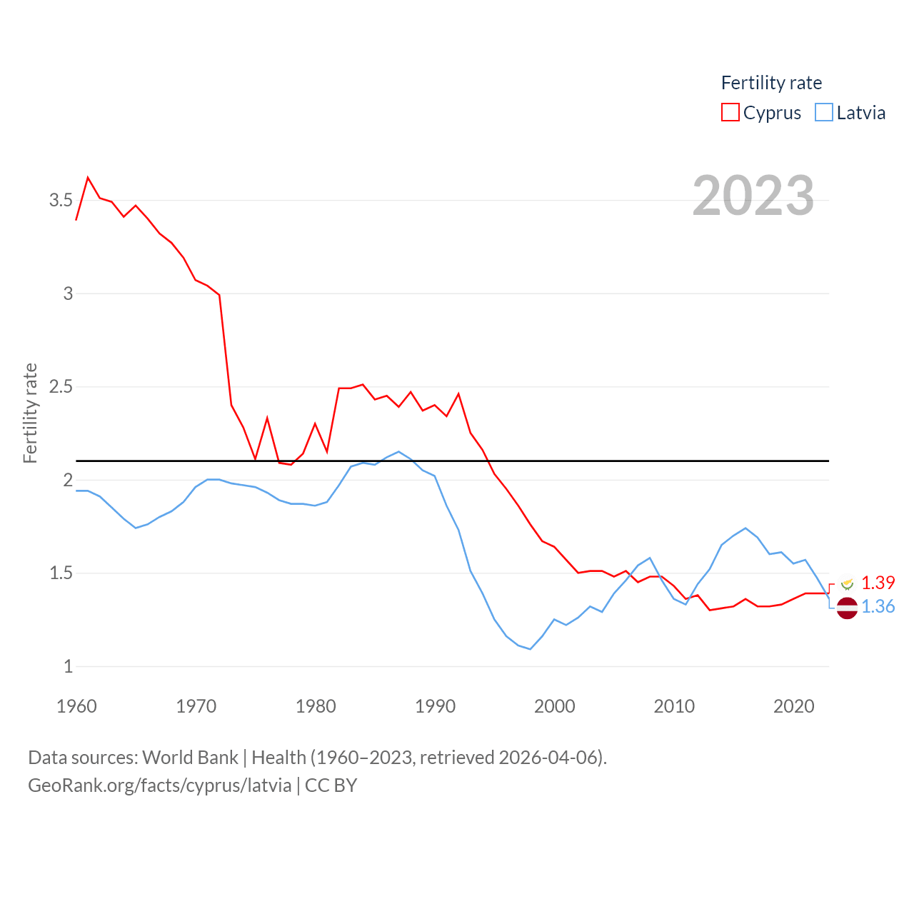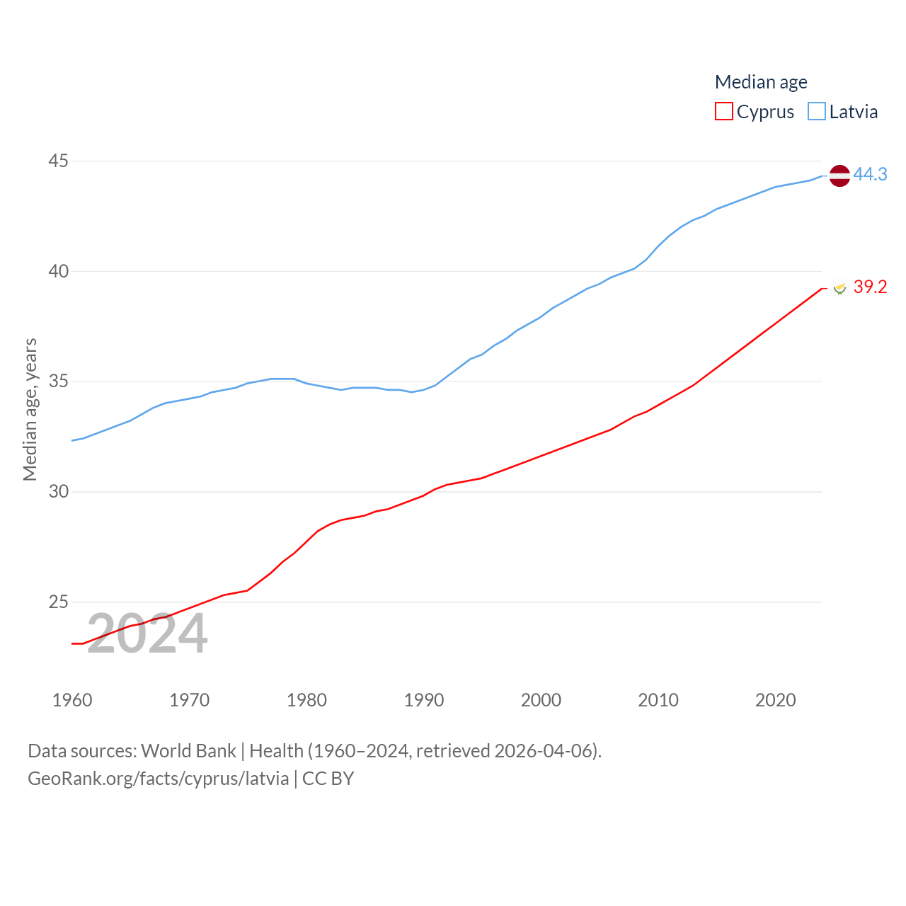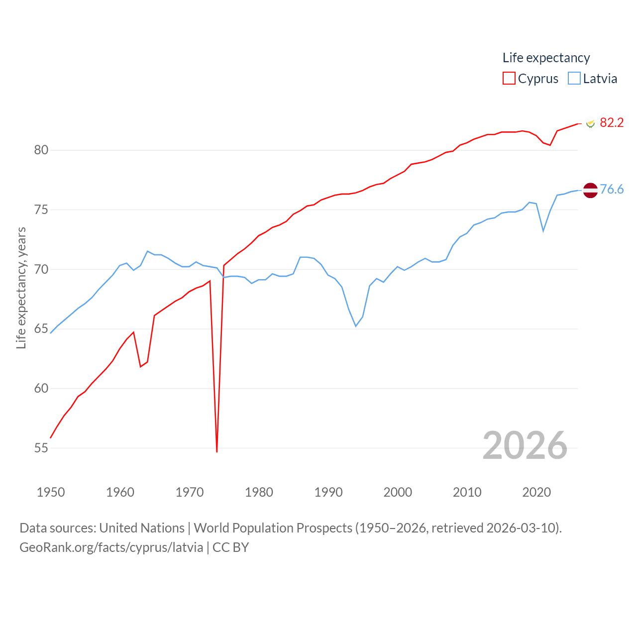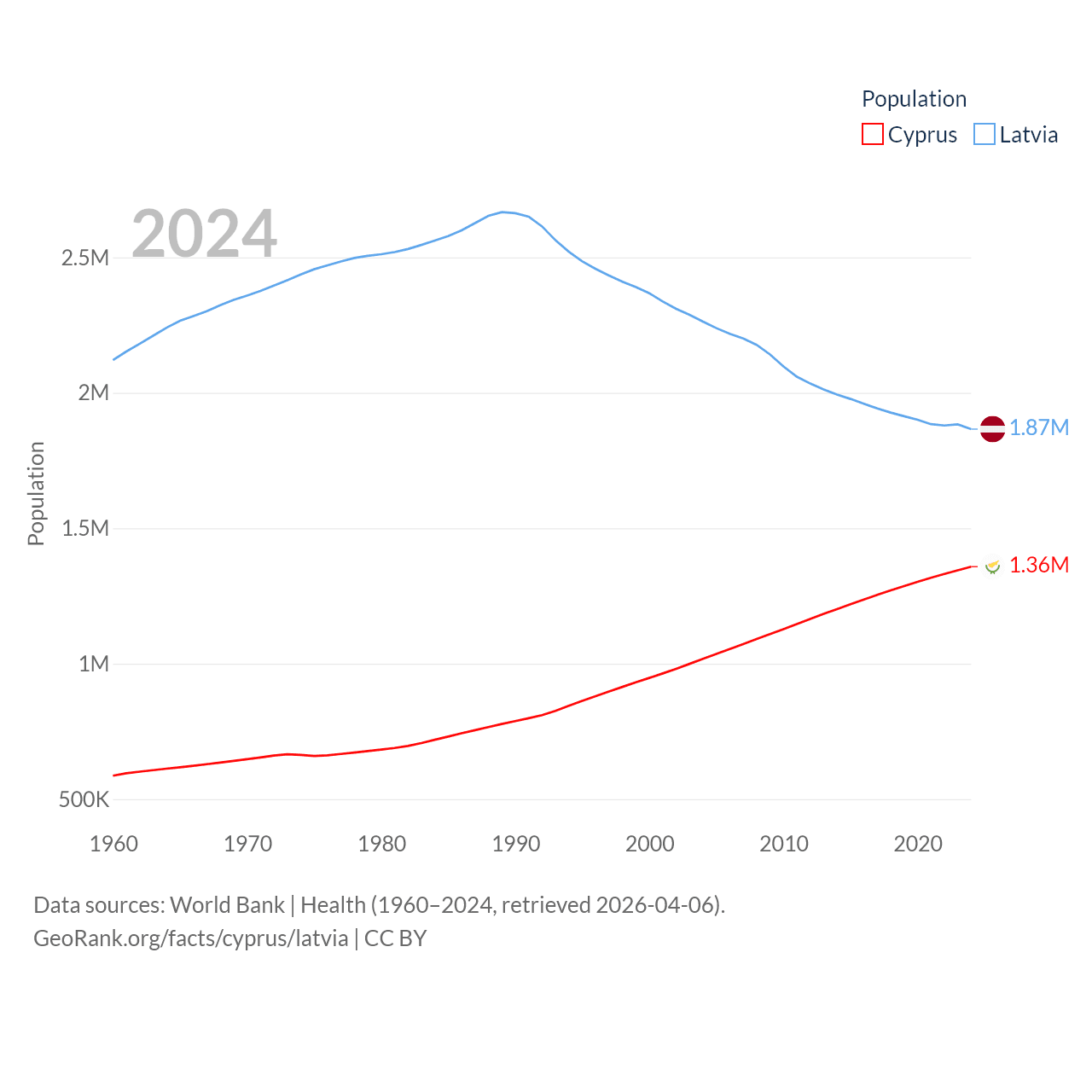 Cyprus has a population of 1.36M (ranked 155/197), compared with 1.87M in Latvia (ranked 149/197). Cyprus' land area is 3,568 sq mi versus 24,027 sq mi for Latvia (ranked 163rd vs. 121st).