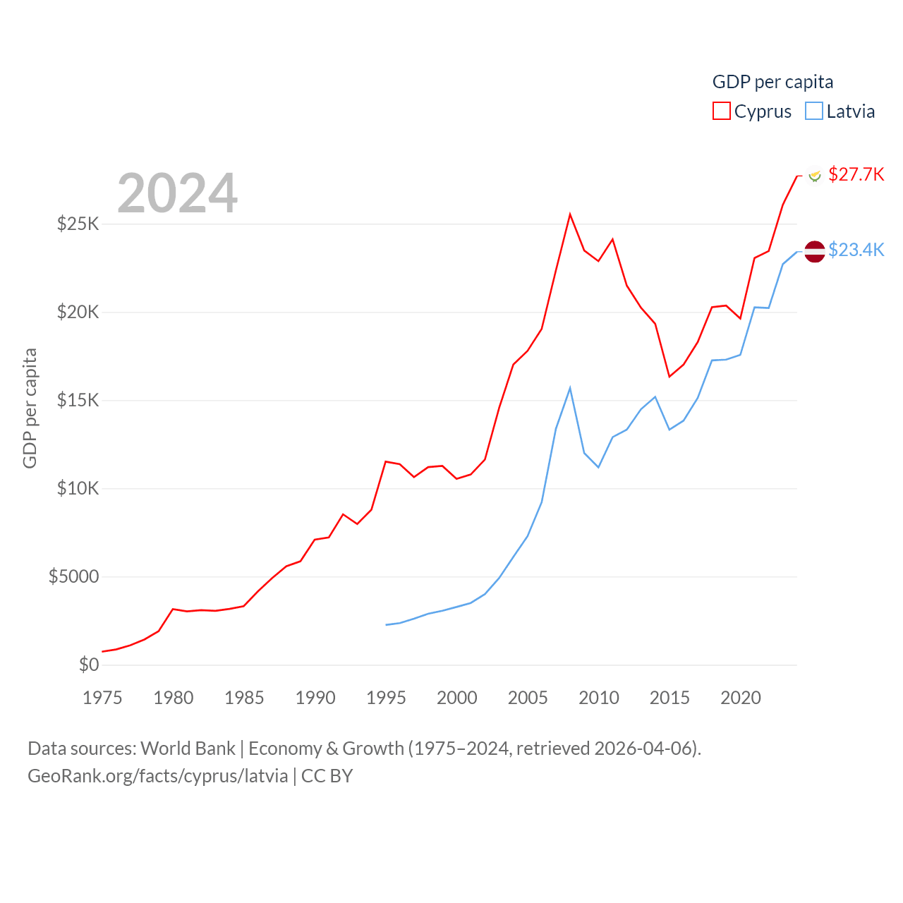 By GDP, Cyprus ranks 103/197 ($37.6B) and Latvia ranks 99/197 ($43.7B). By GDP per capita, Cyprus ranks 45/197 ($27,707), while Latvia ranks 54/197 ($23,409).