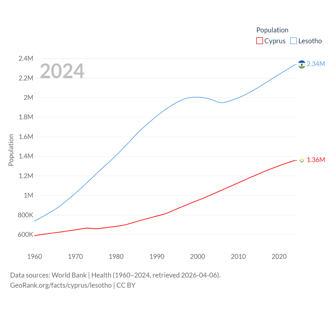 Cyprus has a population of 1.36M (ranked 155/197), compared with 2.34M in Lesotho (ranked 145/197). Cyprus' land area is 3,568 sq mi versus 11,722 sq mi for Lesotho (ranked 163rd vs. 137th).