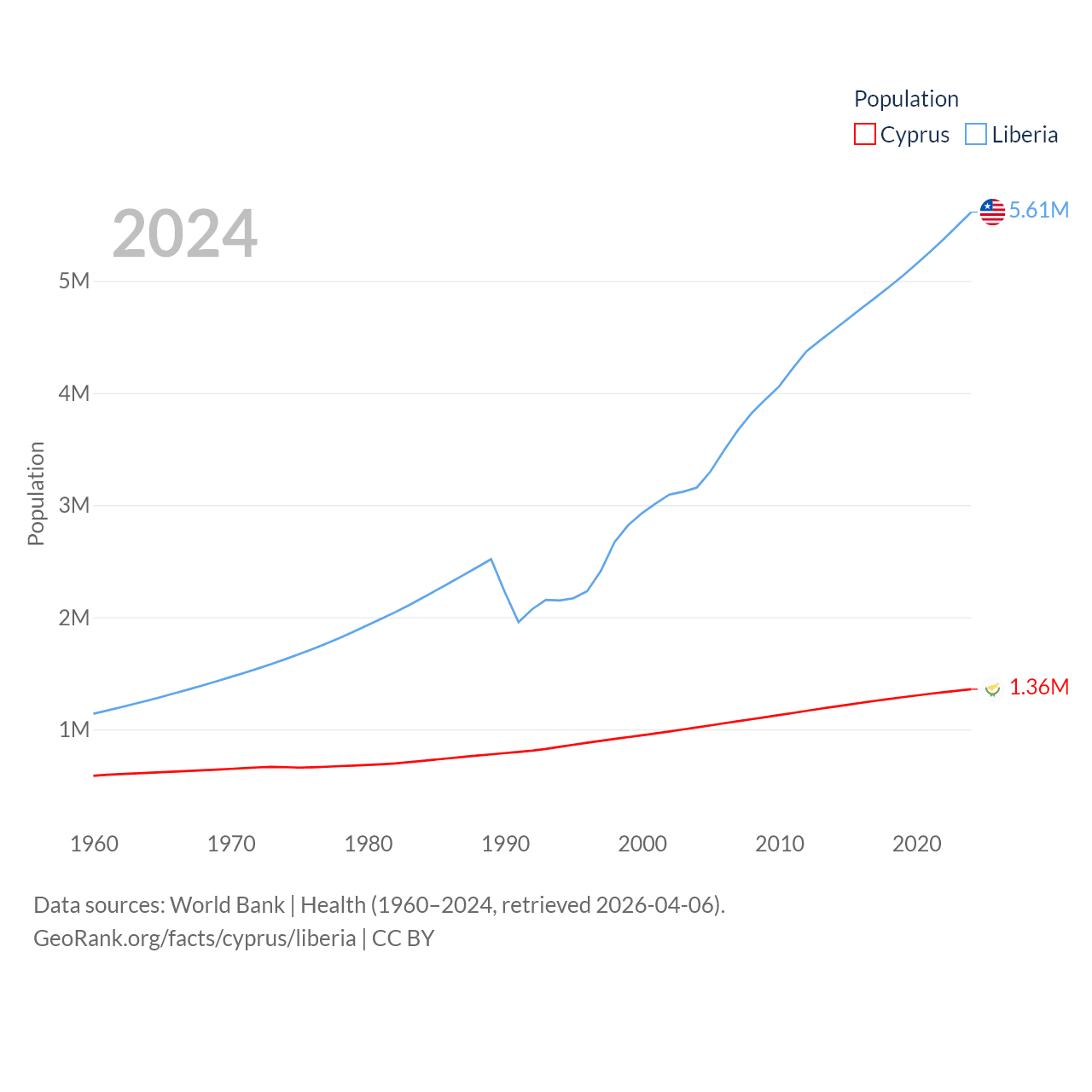Cyprus has a population of 1.36M (ranked 155/197), compared with 5.61M in Liberia (ranked 117/197). Cyprus' land area is 3,568 sq mi versus 37,189 sq mi for Liberia (ranked 163rd vs. 106th).