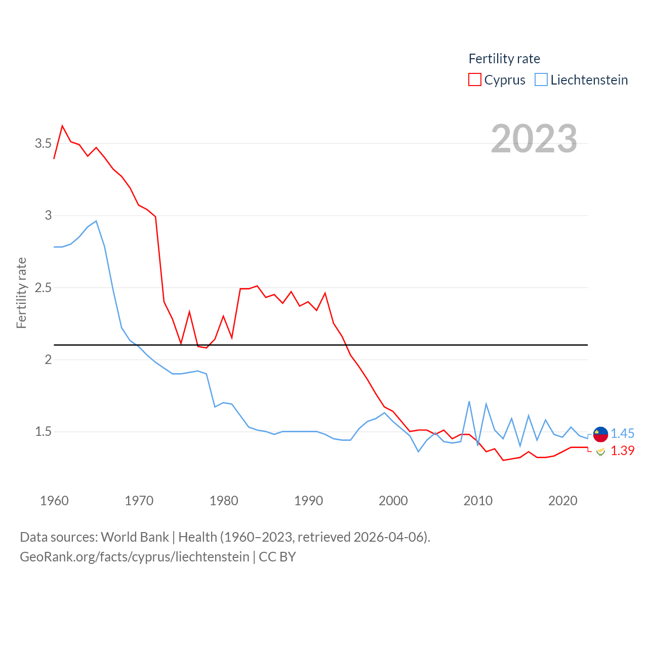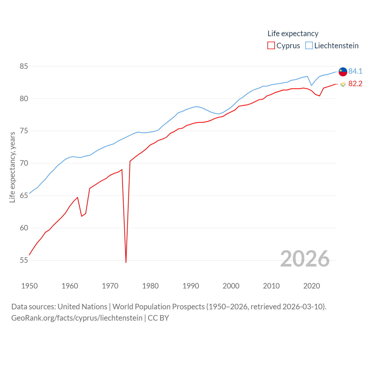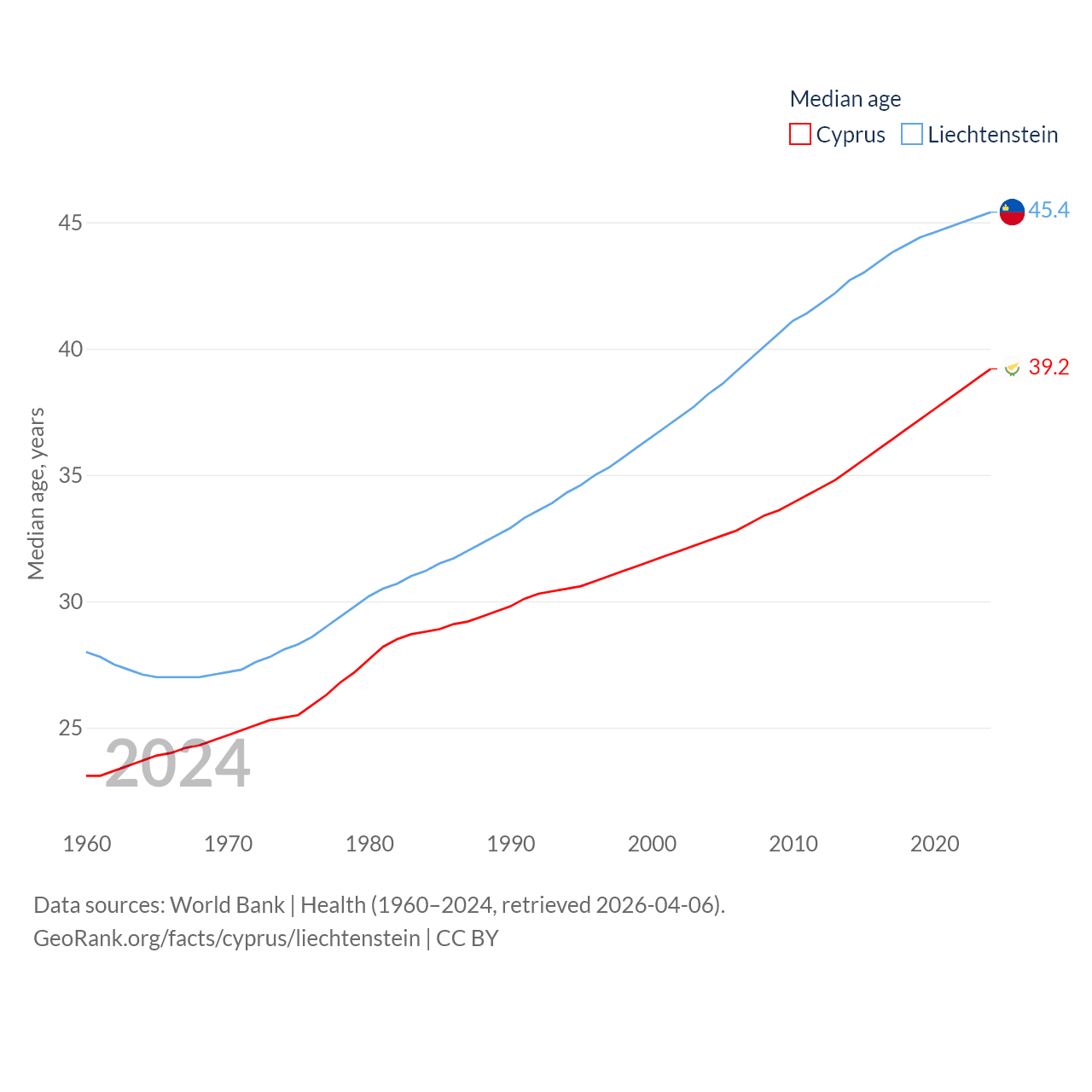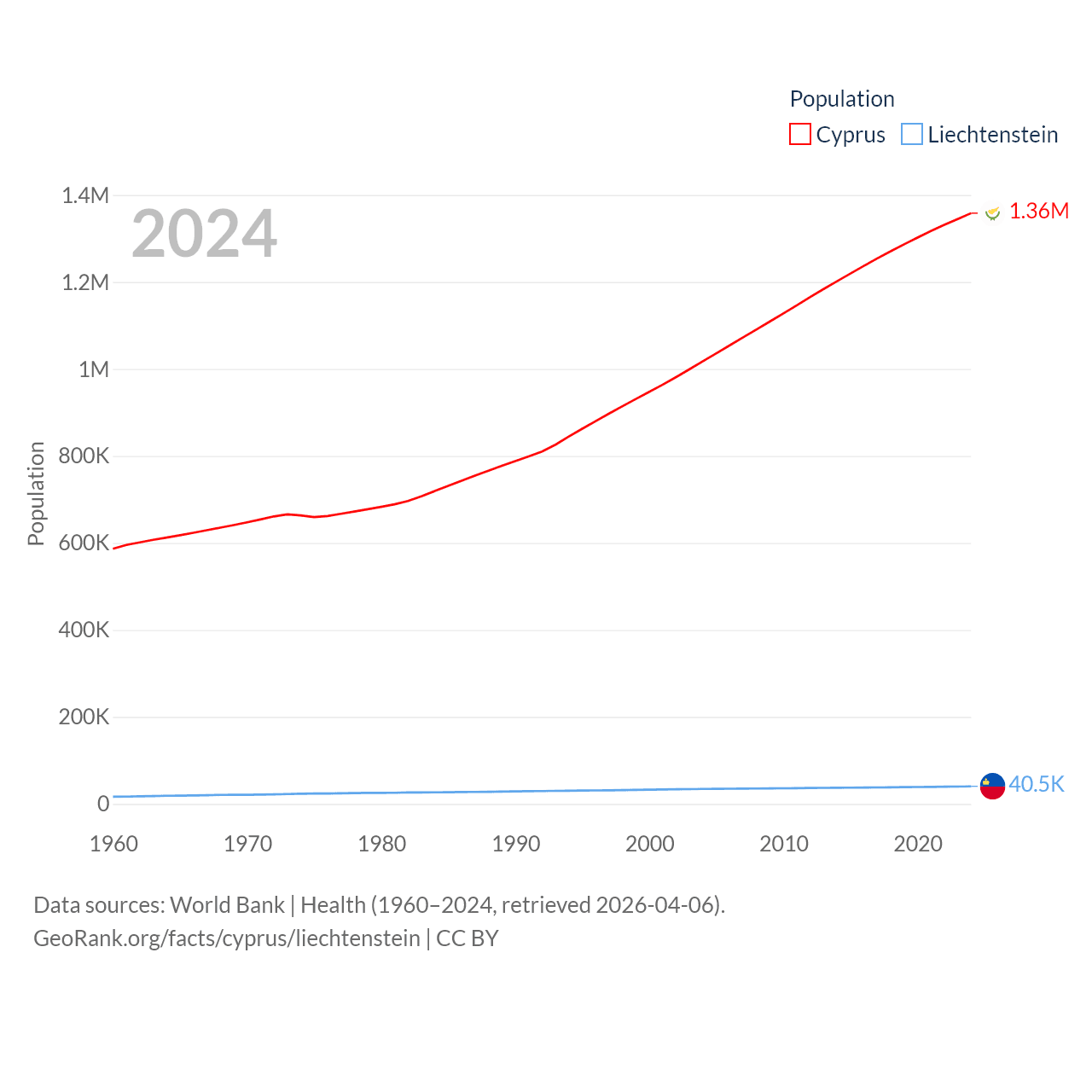 Cyprus has a population of 1.36M (ranked 155/197), compared with 40.4K in Liechtenstein (ranked 190/197). Cyprus' land area is 3,568 sq mi versus 61.8 sq mi for Liechtenstein (ranked 163rd vs. 192nd).