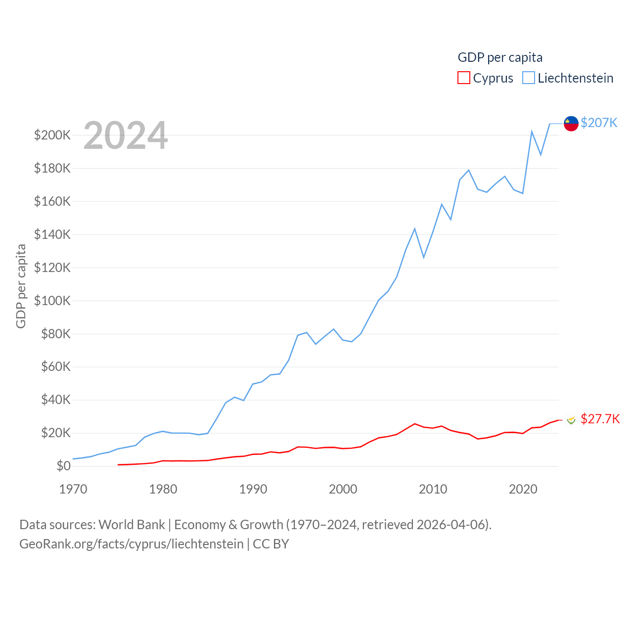 By GDP, Cyprus ranks 103/197 ($37.6B) and Liechtenstein ranks 156/197 ($8.24B). By GDP per capita, Cyprus ranks 45/197 ($27,707), while Liechtenstein ranks 2/197 ($206,781).