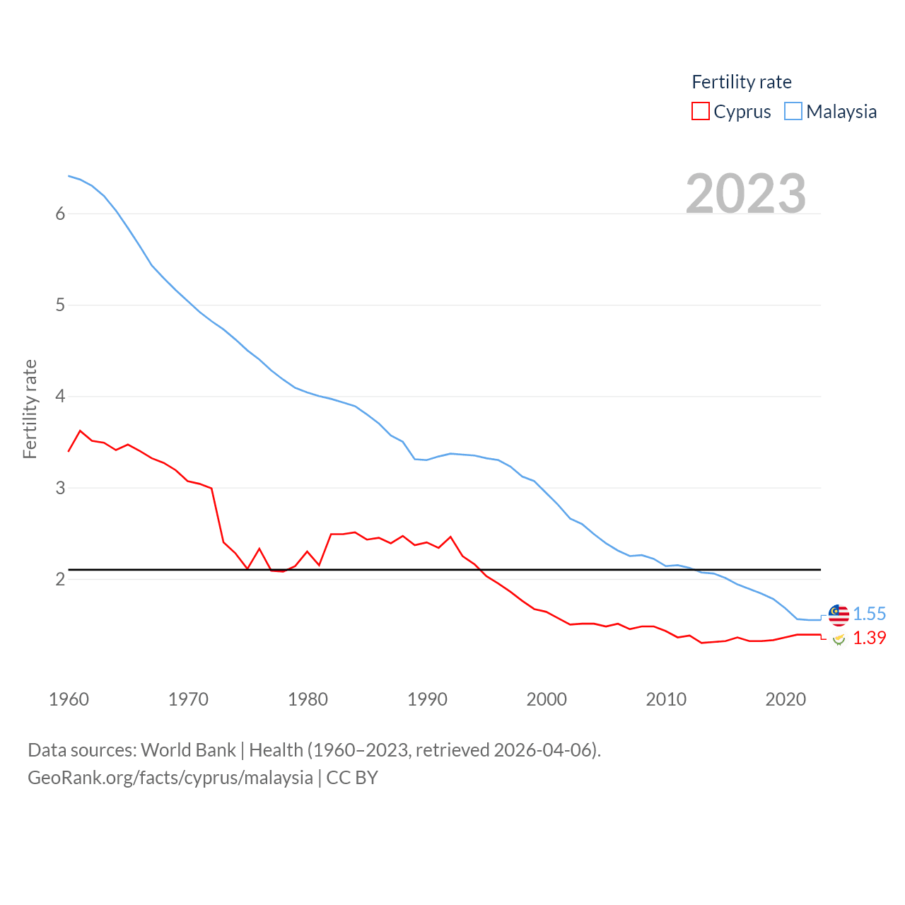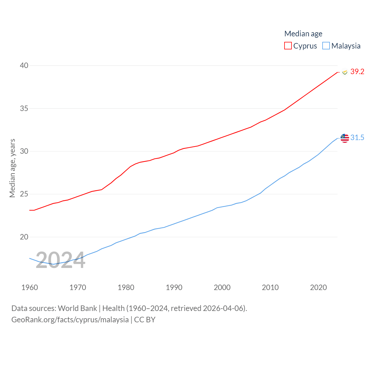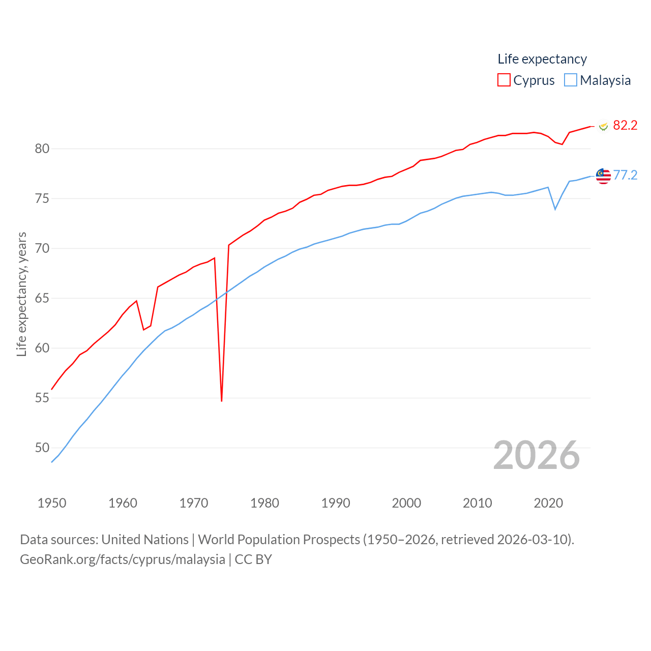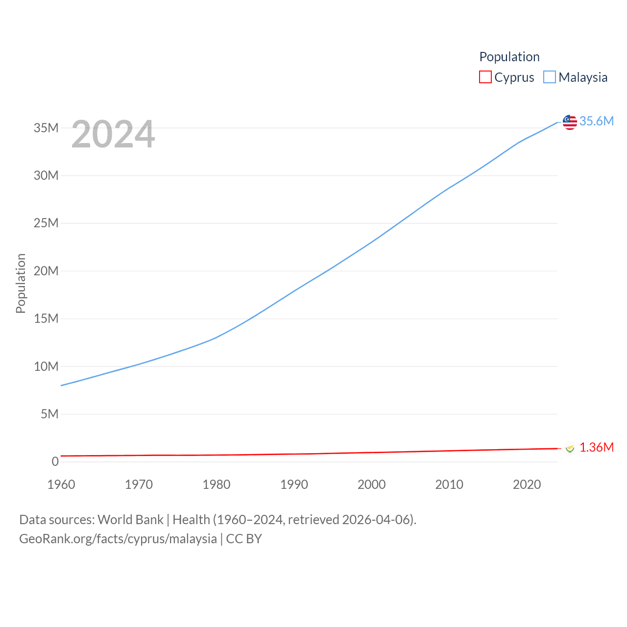 Cyprus has a population of 1.36M (ranked 155/197), compared with 35.6M in Malaysia (ranked 44/197). Cyprus' land area is 3,568 sq mi versus 126,854 sq mi for Malaysia (ranked 163rd vs. 65th).