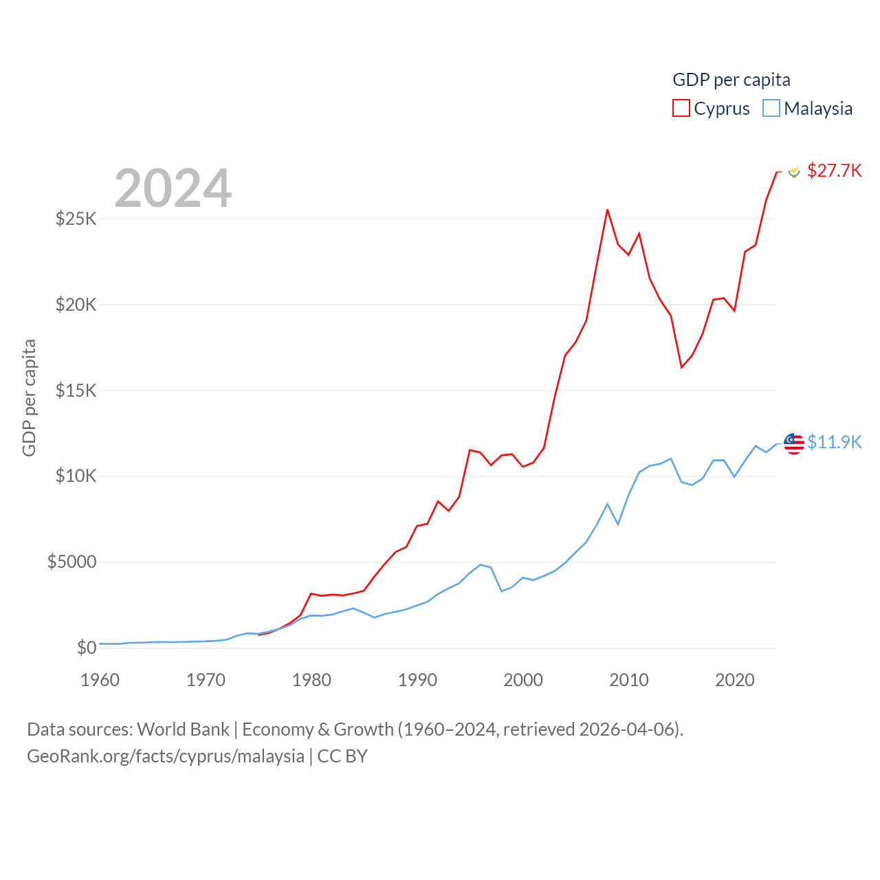 By GDP, Cyprus ranks 103/197 ($37.6B) and Malaysia ranks 38/197 ($422B). By GDP per capita, Cyprus ranks 45/197 ($27,707), while Malaysia ranks 79/197 ($11,874).