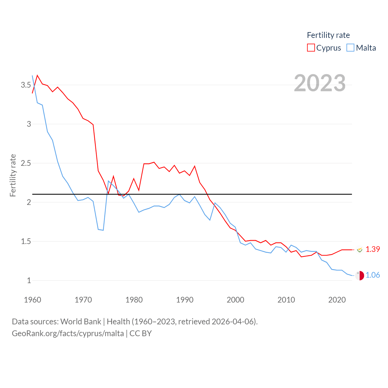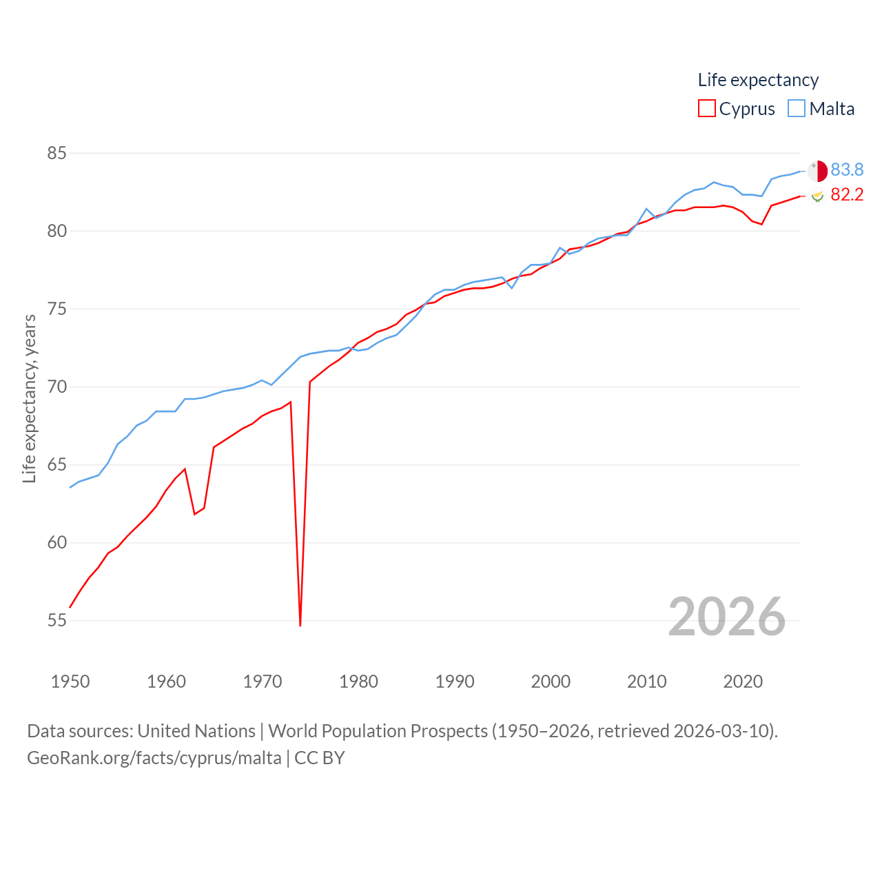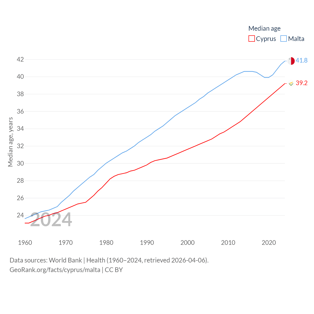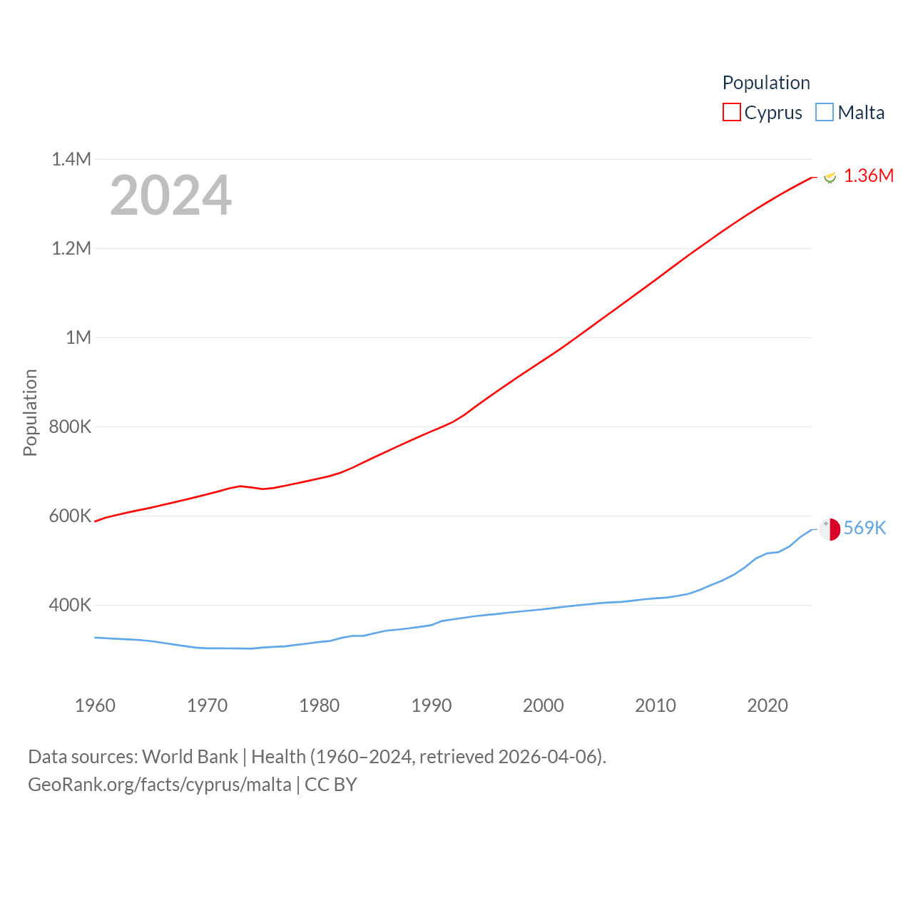 Cyprus has a population of 1.36M (ranked 155/197), compared with 569K in Malta (ranked 167/197). Cyprus' land area is 3,568 sq mi versus 123.6 sq mi for Malta (ranked 163rd vs. 187th).