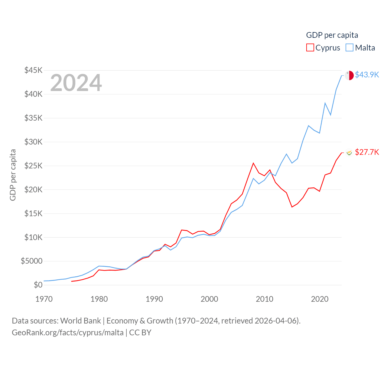 By GDP, Cyprus ranks 103/197 ($37.6B) and Malta ranks 119/197 ($25B). By GDP per capita, Cyprus ranks 45/197 ($27,707), while Malta ranks 28/197 ($43,899).