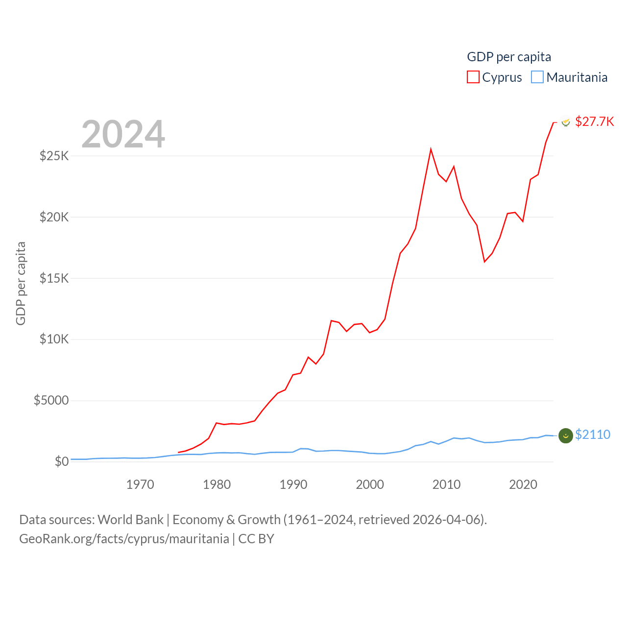 By GDP, Cyprus ranks 103/197 ($37.6B) and Mauritania ranks 153/197 ($10.9B). By GDP per capita, Cyprus ranks 45/197 ($27,707), while Mauritania ranks 156/197 ($2,110).