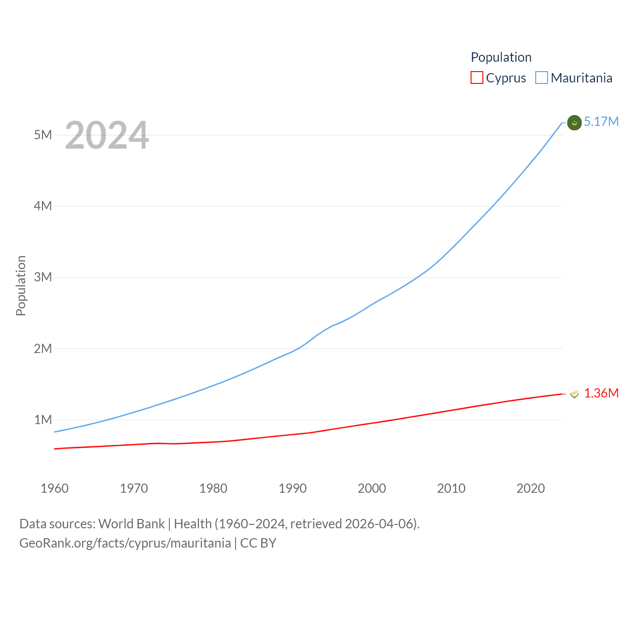 Cyprus has a population of 1.36M (ranked 155/197), compared with 5.17M in Mauritania (ranked 125/197). Cyprus' land area is 3,568 sq mi versus 397,955 sq mi for Mauritania (ranked 163rd vs. 28th).