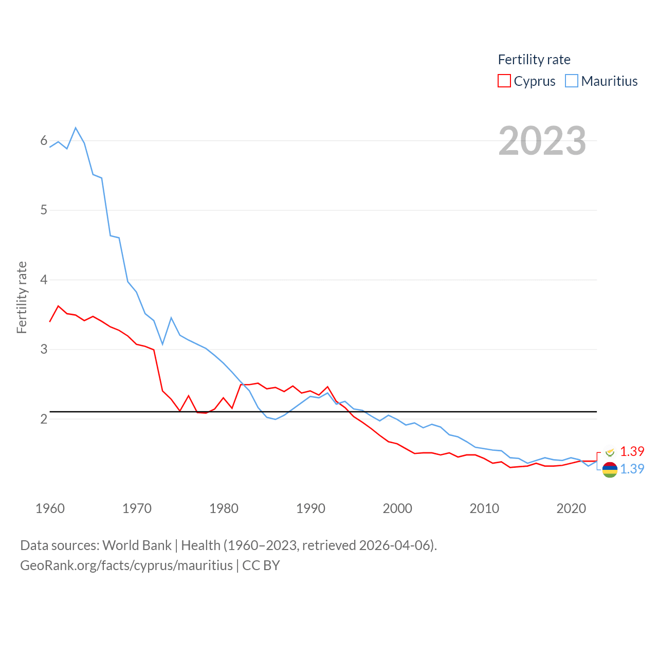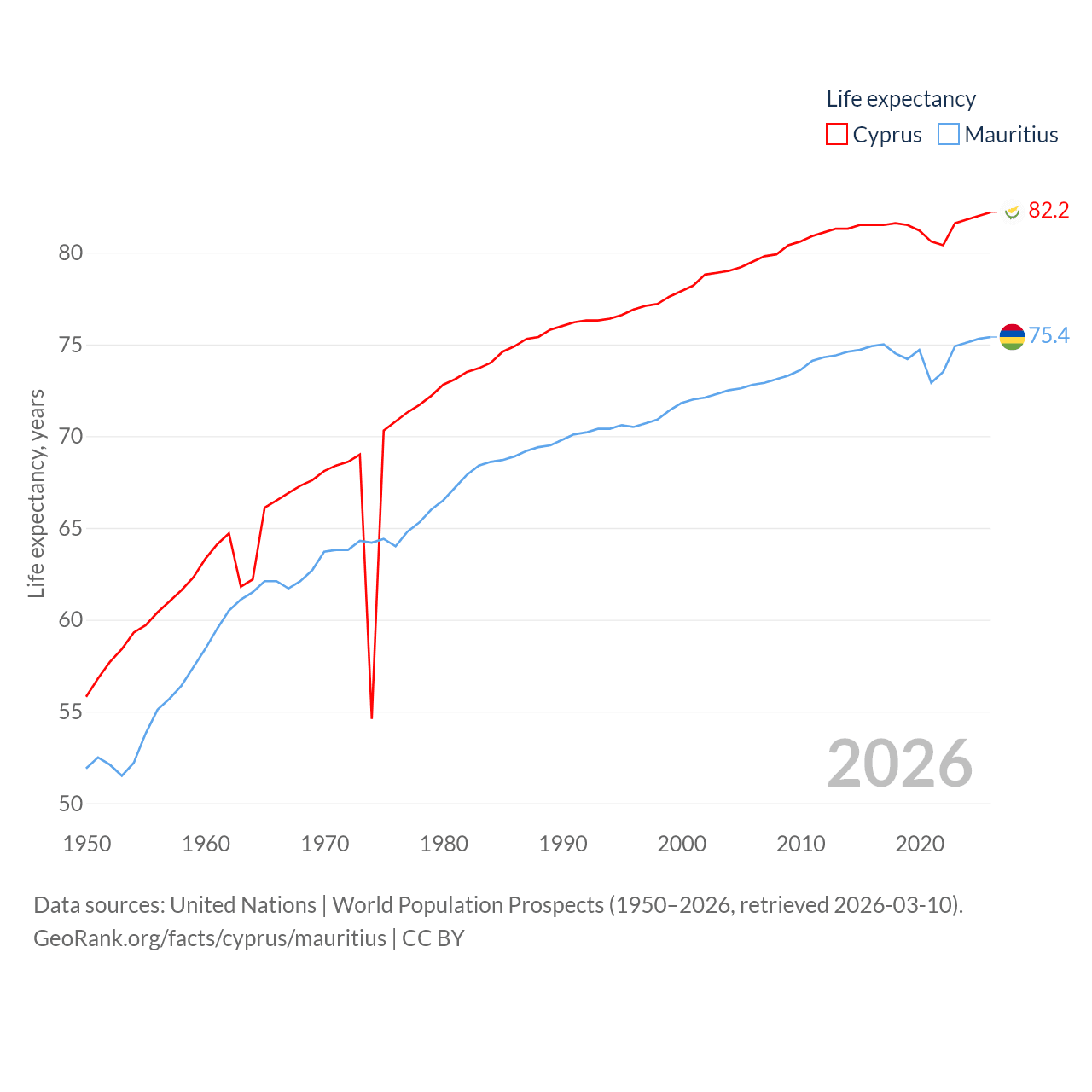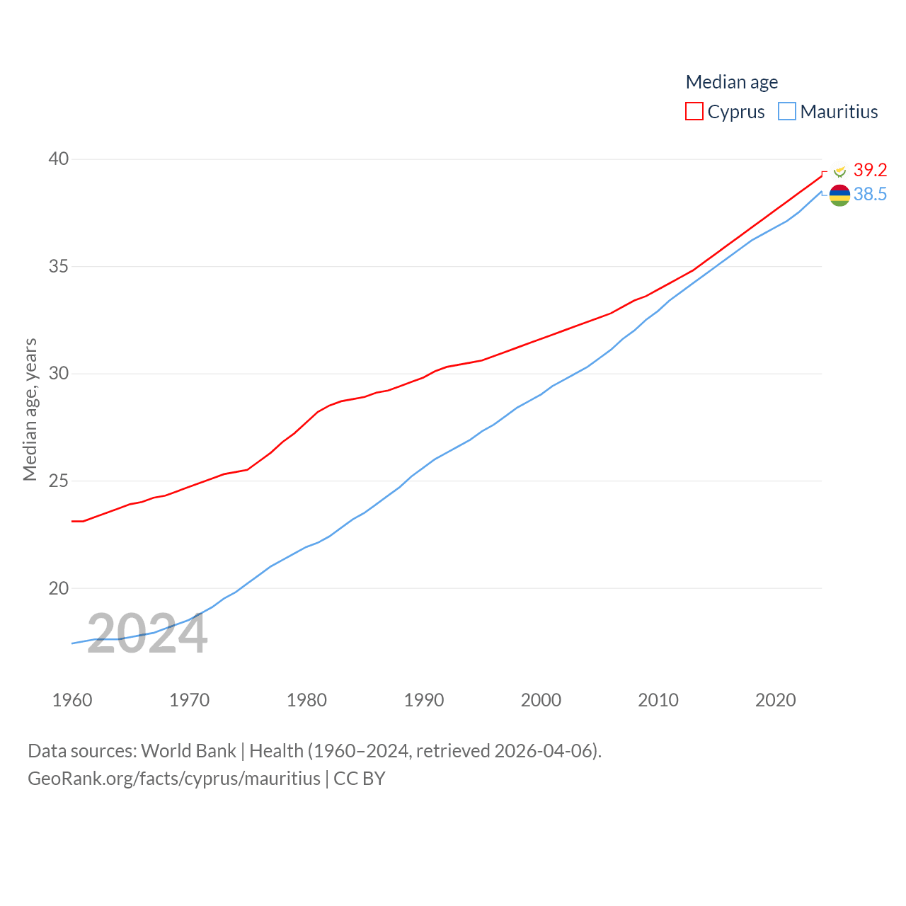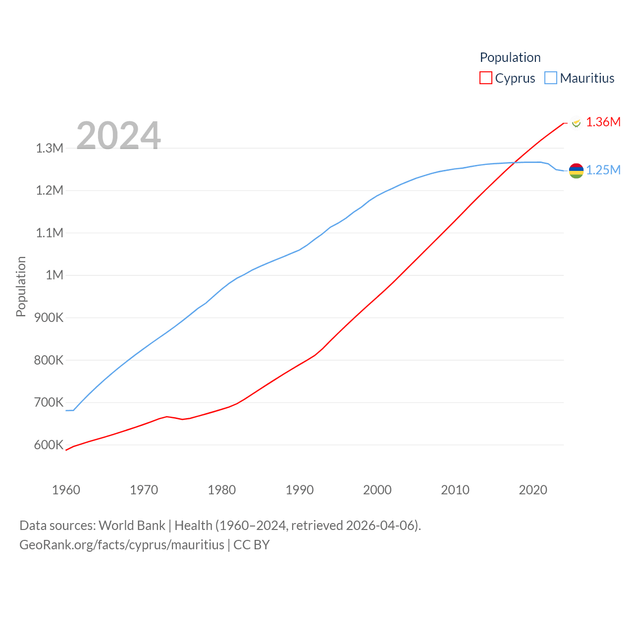 Cyprus has a population of 1.36M (ranked 155/197), compared with 1.25M in Mauritius (ranked 156/197). Cyprus' land area is 3,568 sq mi versus 771 sq mi for Mauritius (ranked 163rd vs. 170th).