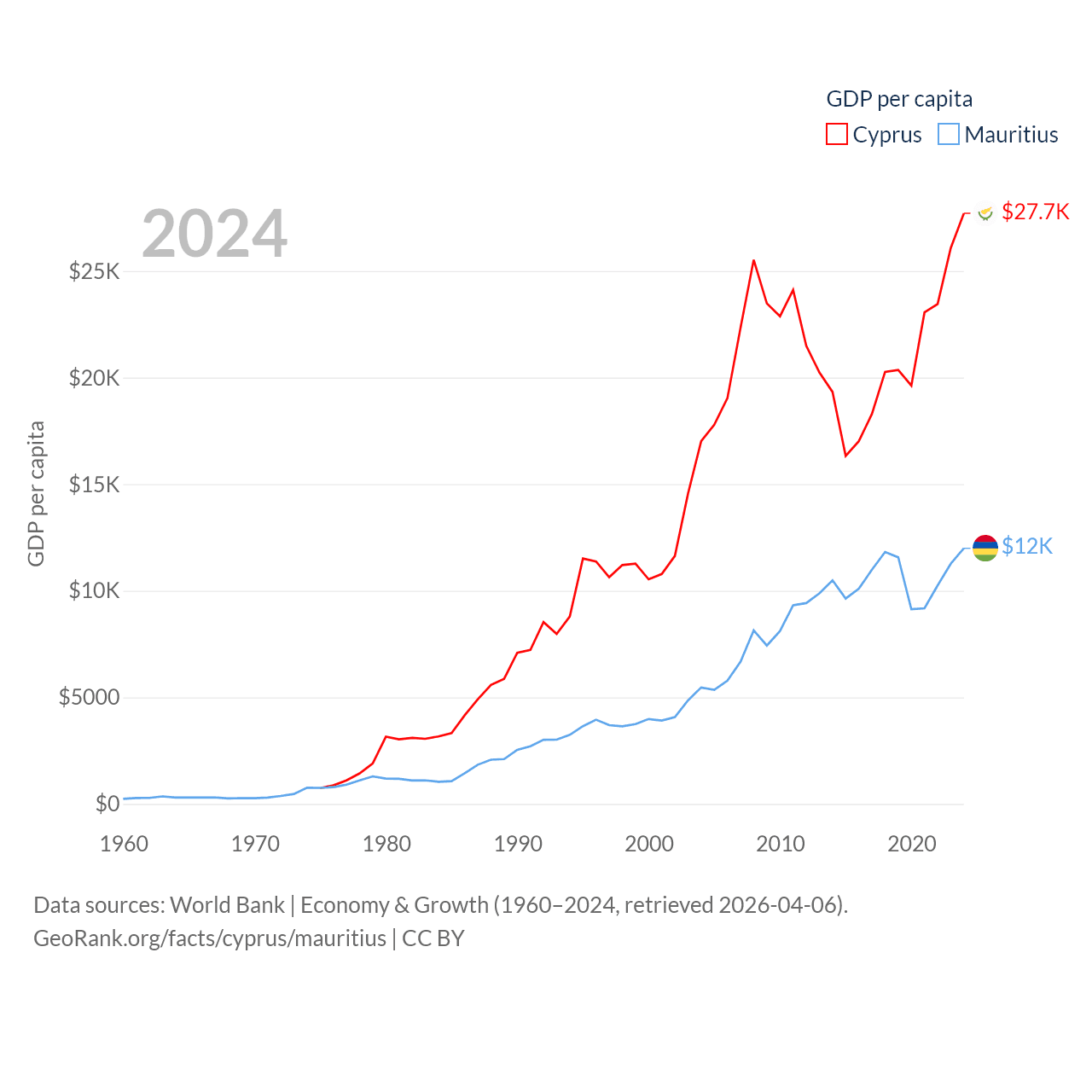 By GDP, Cyprus ranks 103/197 ($37.6B) and Mauritius ranks 143/197 ($14.9B). By GDP per capita, Cyprus ranks 45/197 ($27,707), while Mauritius ranks 78/197 ($11,991).