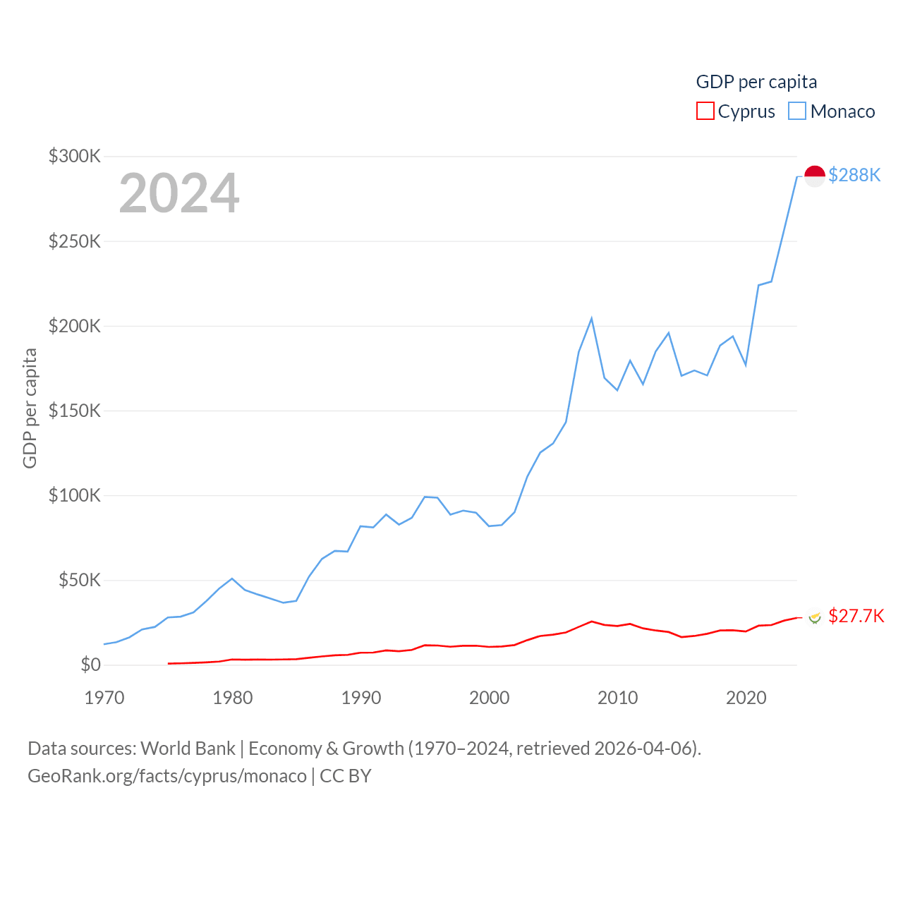By GDP, Cyprus ranks 103/197 ($37.6B) and Monaco ranks 152/197 ($11.1B). By GDP per capita, Cyprus ranks 45/197 ($27,707), while Monaco ranks 1/197 ($288,001).